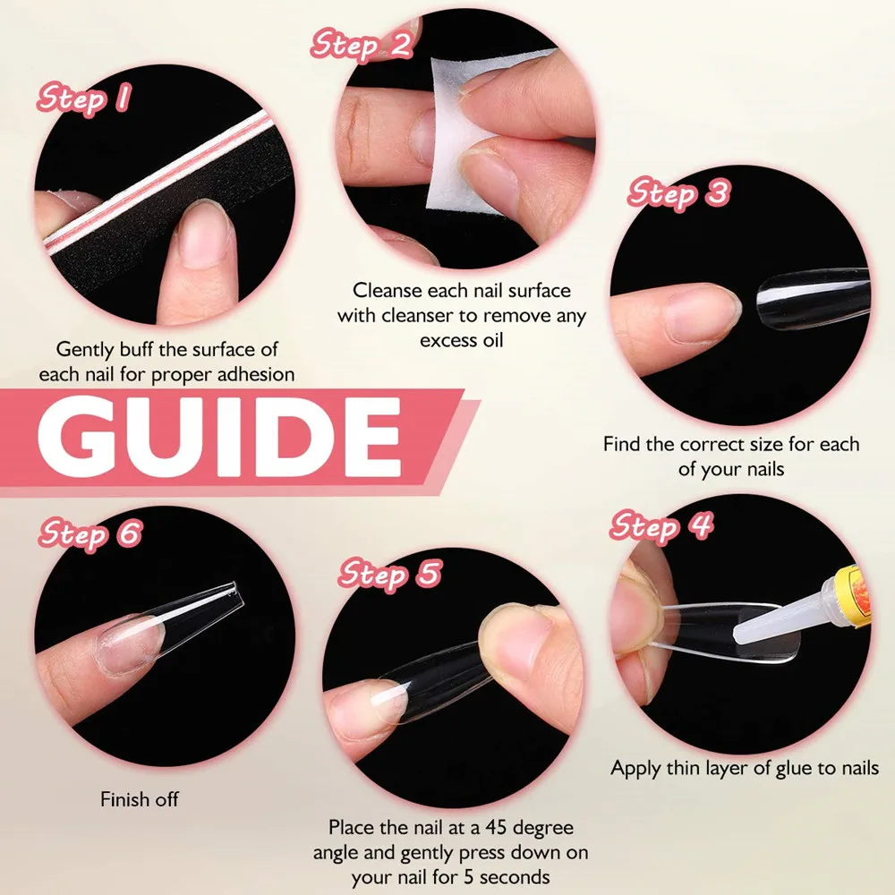 1. Отожмите стороны и область кутикулы для точной посадки с помощью маникюрной палочки;2. Очистите ногти от любого польского масла с помощью ацетона для удаления лака;3. Выберите правильный размер ногтей для каждого пальца;4. Нанесите клей на ногти;5. Нанесите тонкий слой клея на ногти;6. Начиная с кутикулы, нажмите и удерживайте в течение 5 секунд;7. Напиши и формируем новые ногти при необходимости.