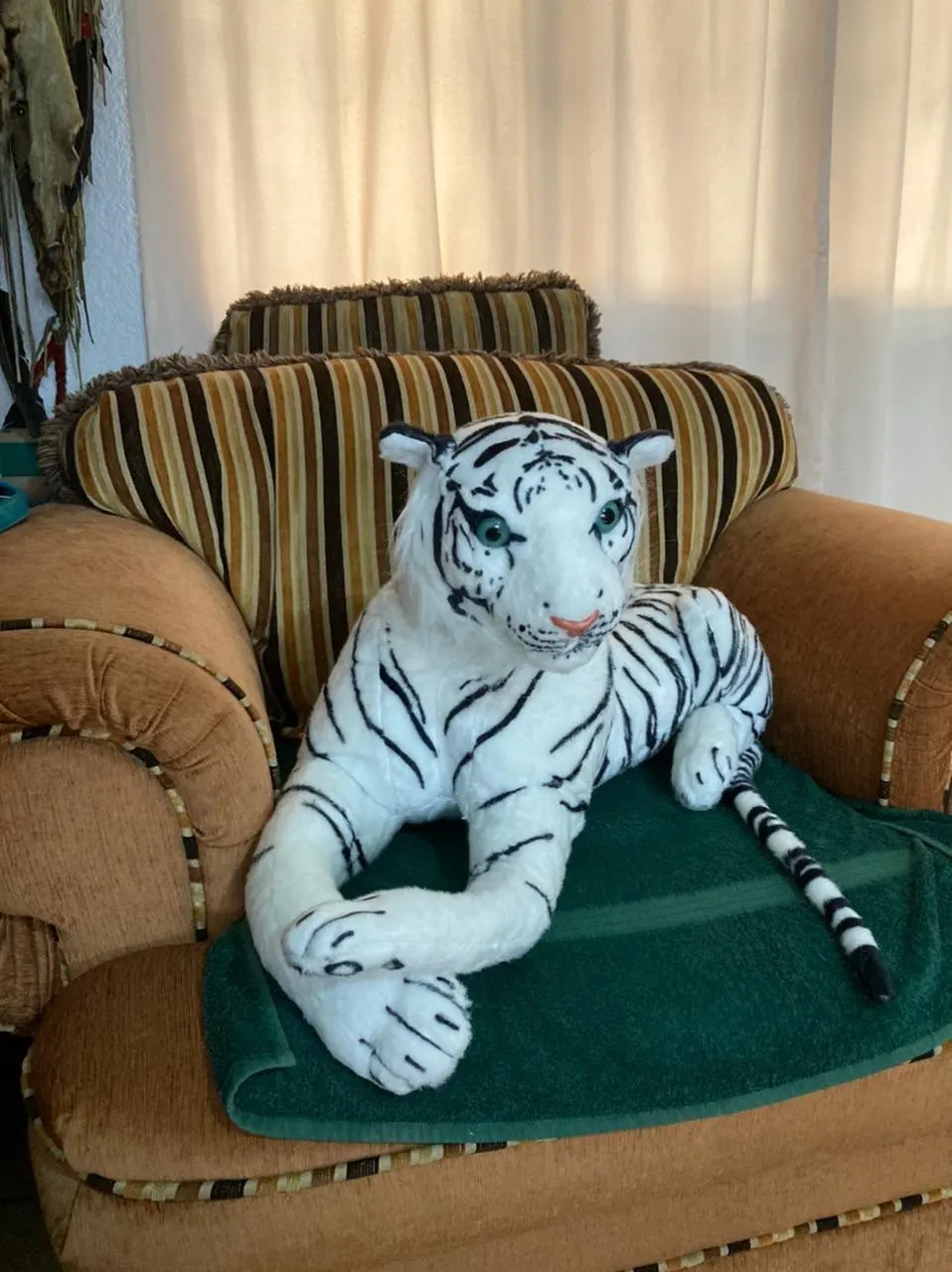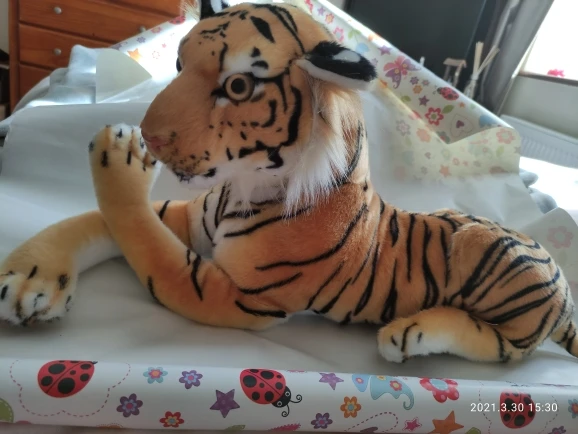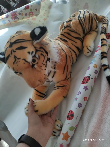 Пришел целый, ребенок в восторге. В голове у игрушки пенопласт для поддержания формы. Заказывал 90см, само тело тигра в длину около 60см (от задницы до груди), но там спереди еще торчат лапы и голова у него поднята достаточно высоко верх, наверное 90см замеряется до этих точек. Но игрушка большая, еще 60см хвост.
