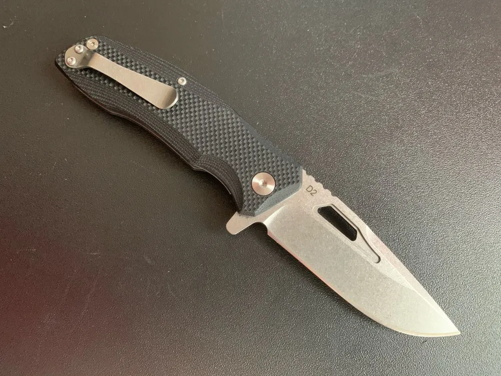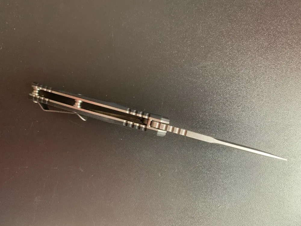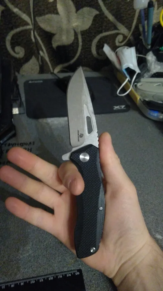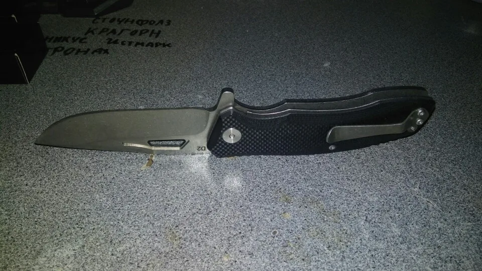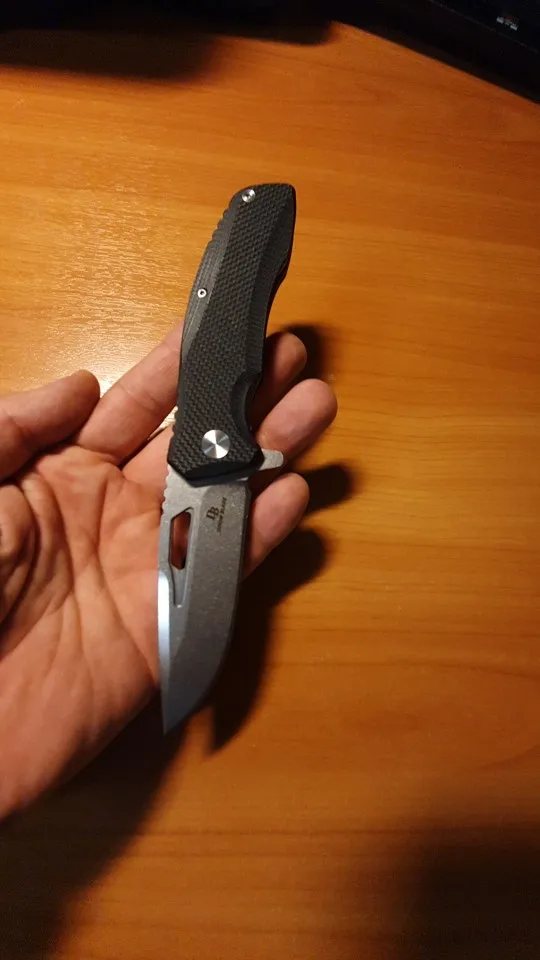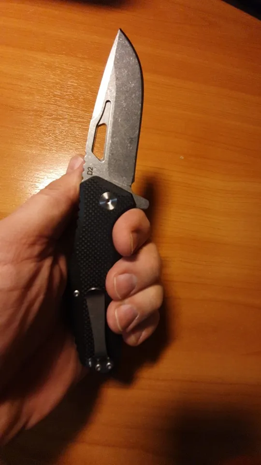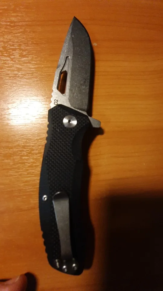 Цвет на фото и фактический не совпадают (на фото оранжевый яркий). Других косяков не выявдено. Заточен остро, сведение ровное, клин по центру, флипует нормально, на рукоятке G10, фаски сняты, замок заходит до центра, клипса очень упругая. Немного коротковат и тяжелый для ношения на кармане, посмотрим как себя покажет в эксплуатации.