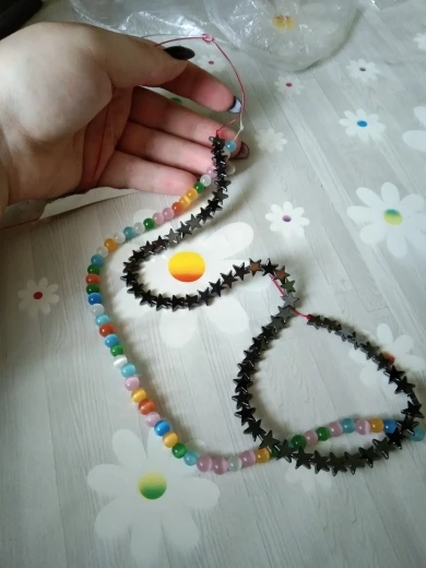 очень маленькие бусинки, сомневаюсь, что натуральный камень ,но очень хочется верить,,,поэтому звезды не снимаю