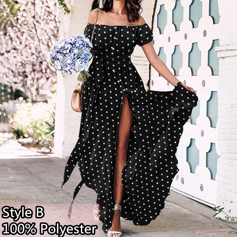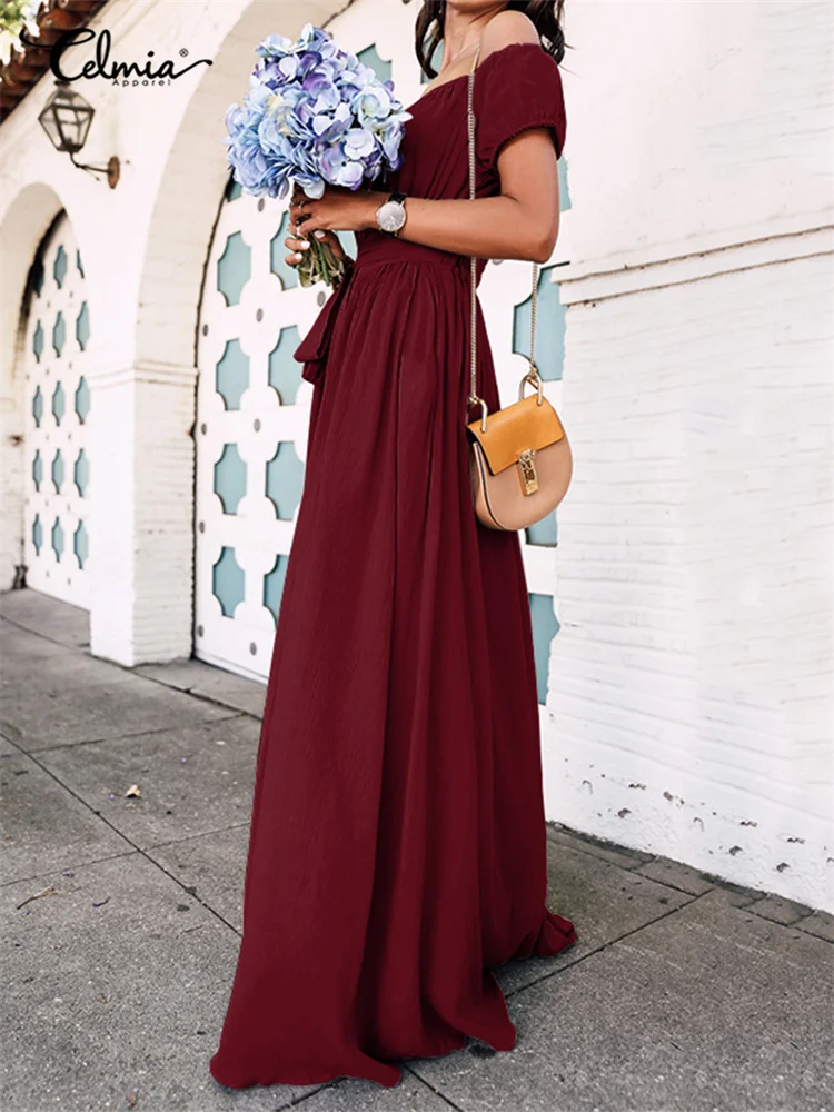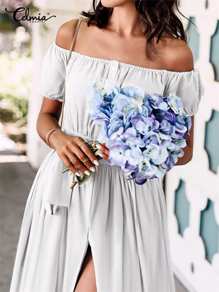 Женские платья-Макси 2023, летнее богемное женское платье, длинное платье с оборками, пикантное платье с открытыми плечами и пуговицами, платье с разрезом на подоле