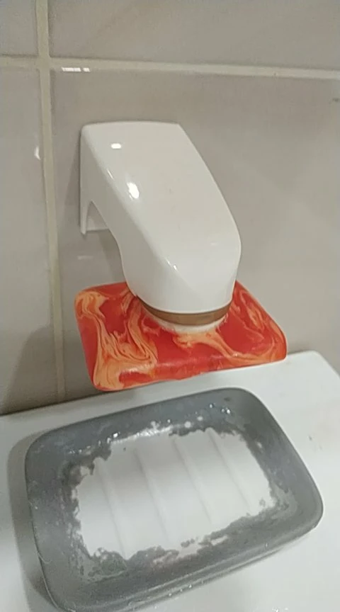 Большой кусок мыла будет держать слабовато. Но небольшие слитки висят нормально. Сама конструкция клеится легко и крепко. Я ещё поверхность обезжирила зараннее. Приклеилась намертво.