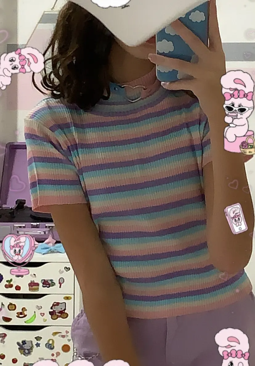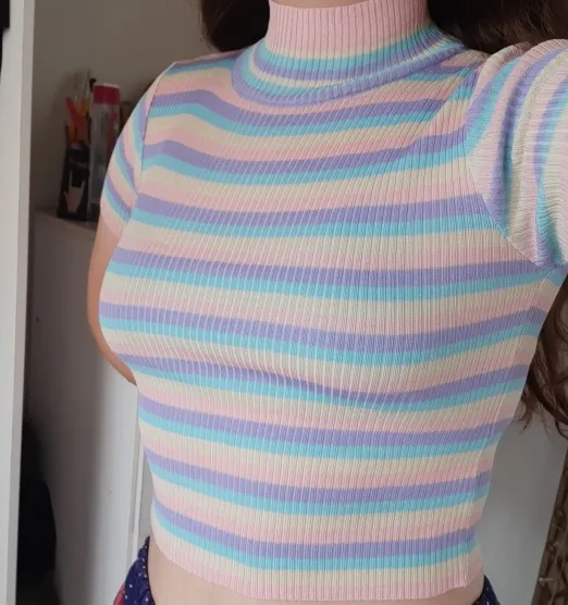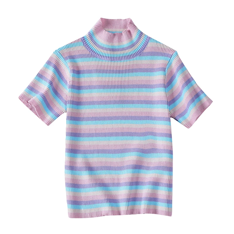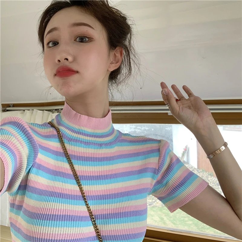 Женская футболка с воротником-стойкой Korobov, разноцветная полосатая укороченная футболка в Корейском стиле, уличная одежда в стиле Харадзюку, лето 78190