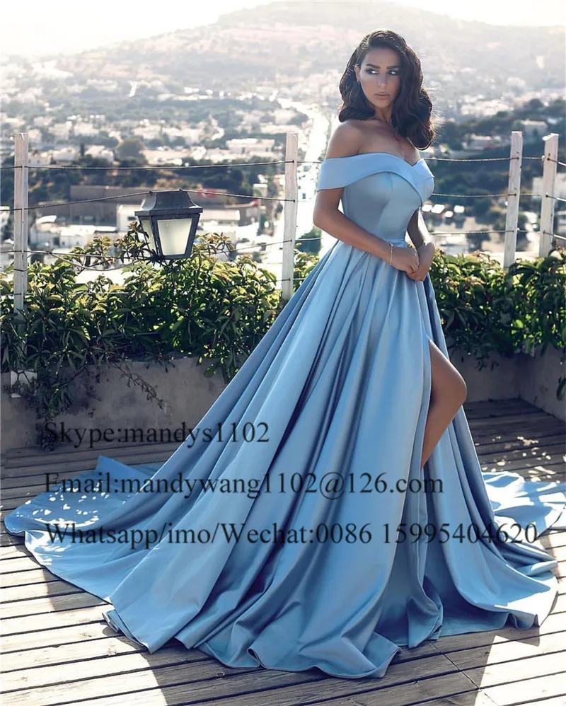 Элегантные атласные синие платья для выпускного вечера с высоким Боковым Разрезом 2021 Сексуальные вечерние платья с открытыми плечами для женщин Robe de soiree