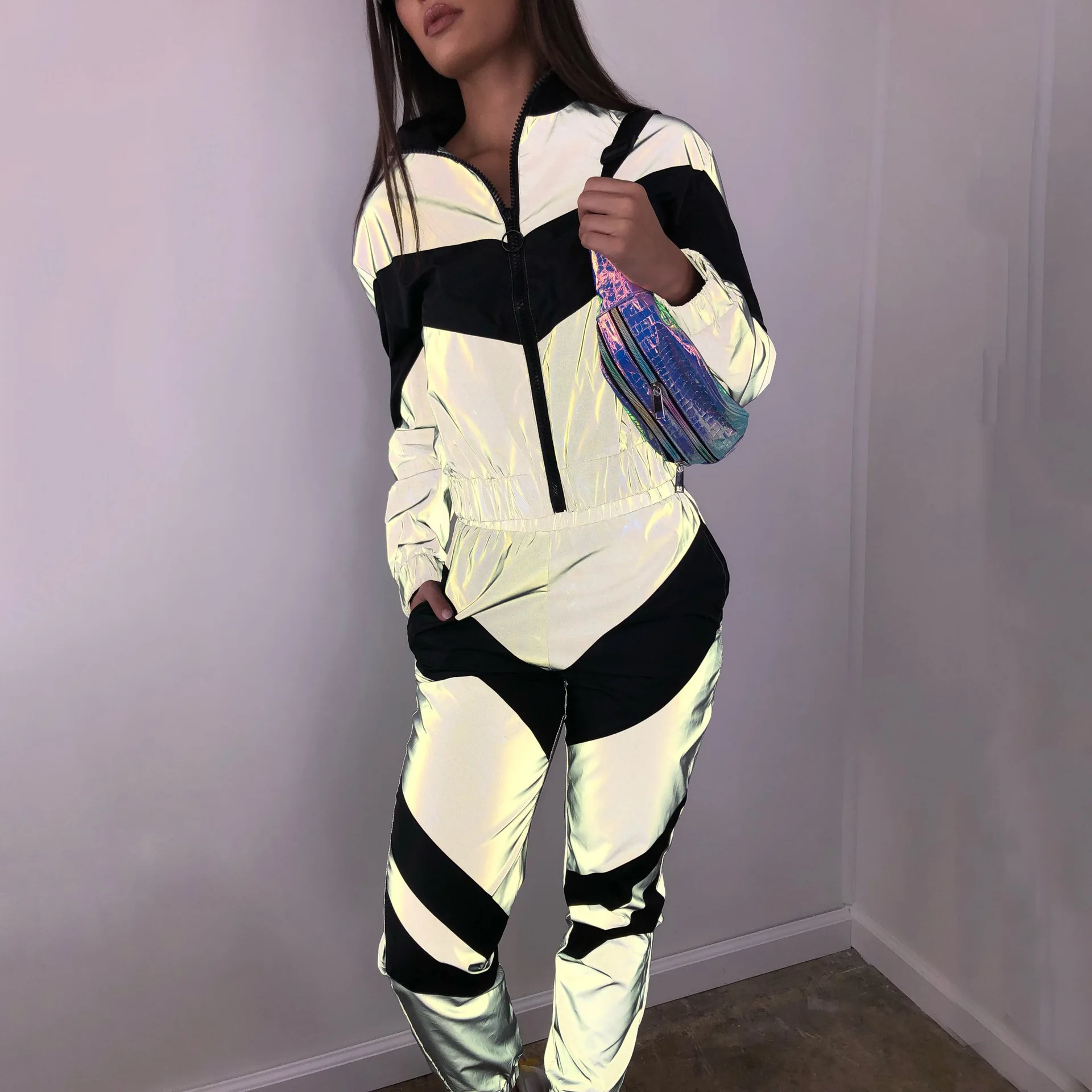 Спортивный костюм женский из светоотражающей ткани: ветровка и штаны