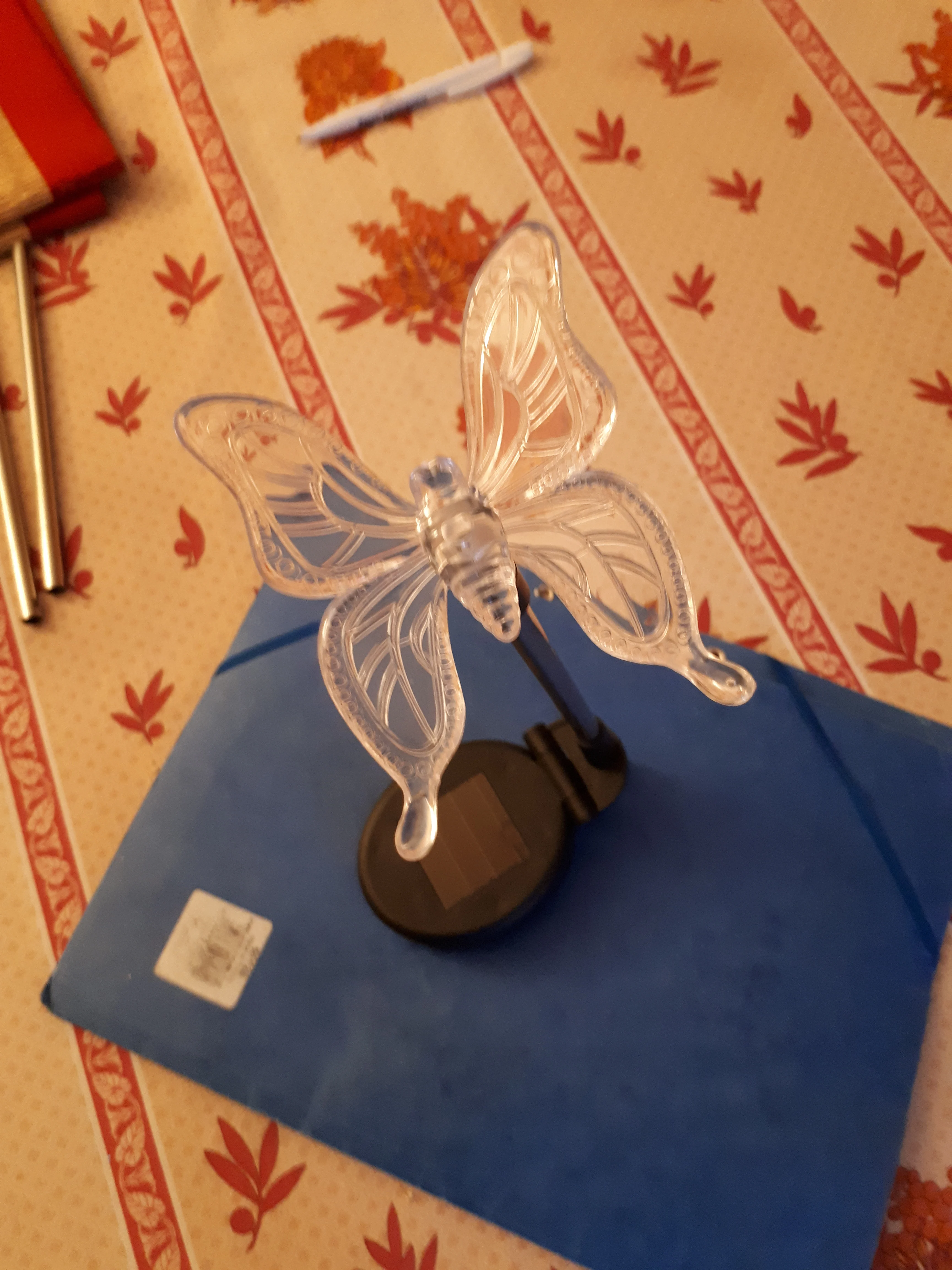 Рекордная отправка-через один час после заказа.Соответствует описанию.Светит очень тускло,подходит как декор.Типа,,вот бабочка села,,.Перед этим заказывала стрекозу тоже светит плохо.Но дополнение к фонарикам нормальное.
