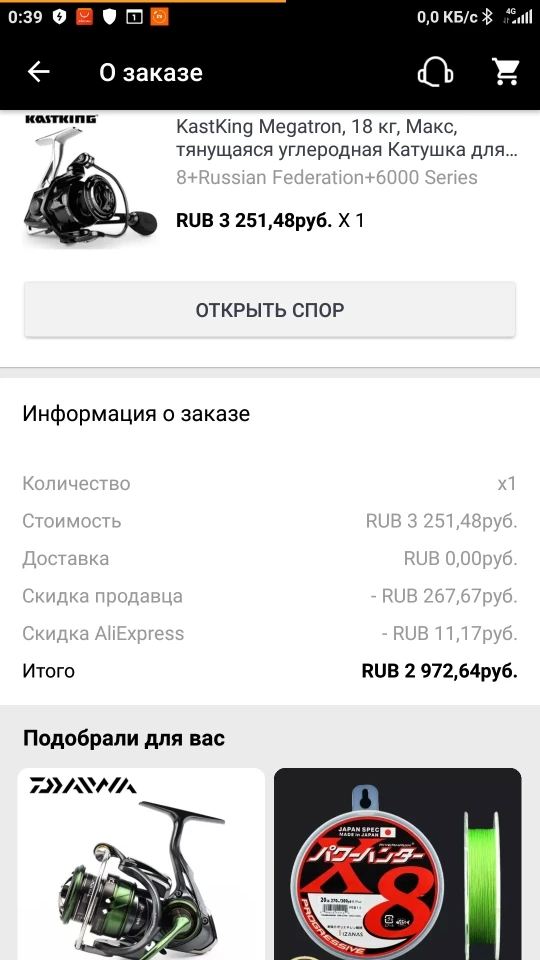 До Волгограда дошла за неделю. Упаковка целая, на вид катушка неплохая за свои деньги единственный недостаток на данный момент ощутимый люфт ручки. Как испробую дополню отзыв.