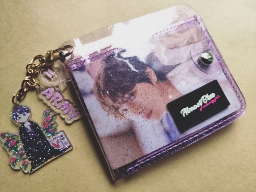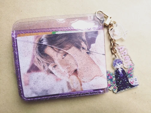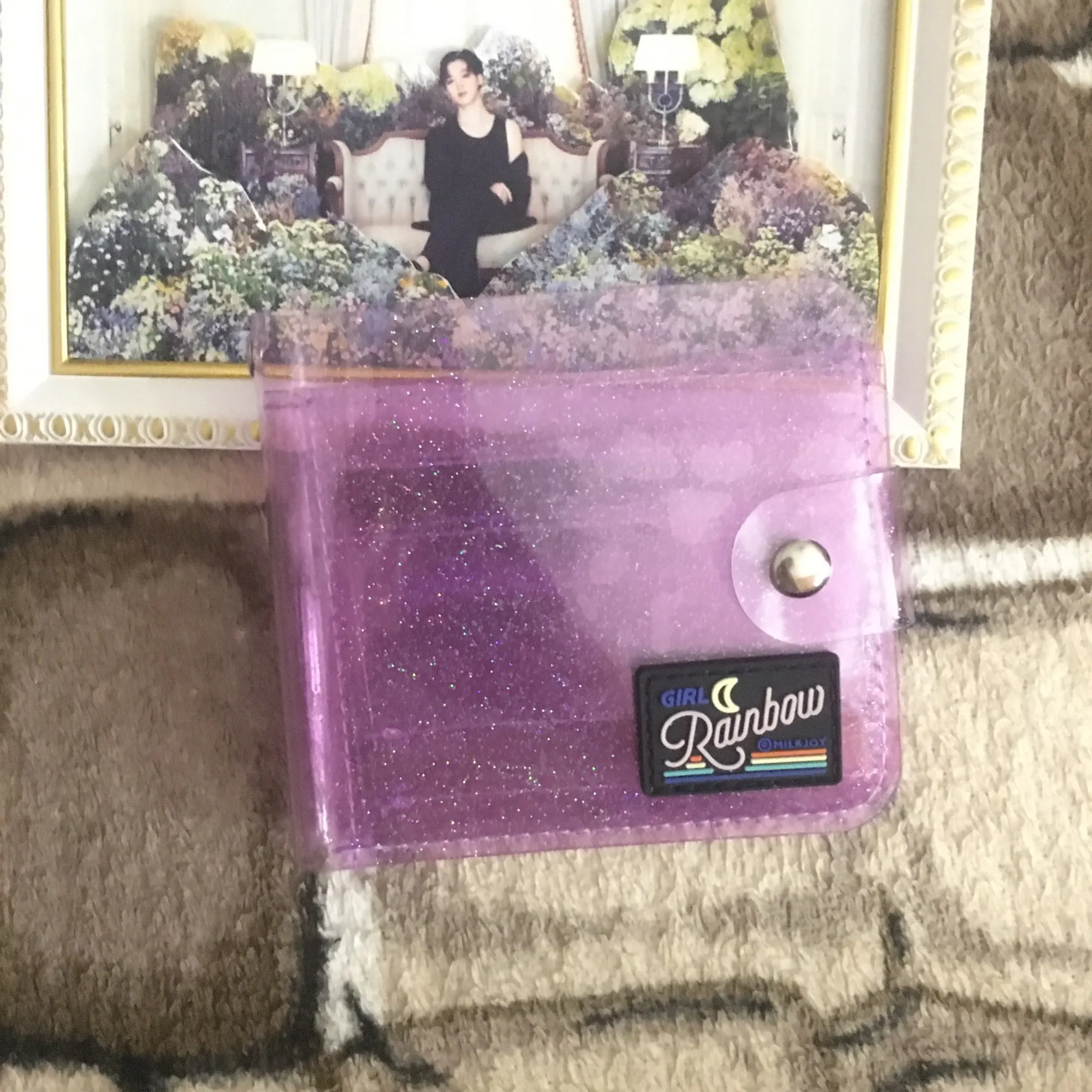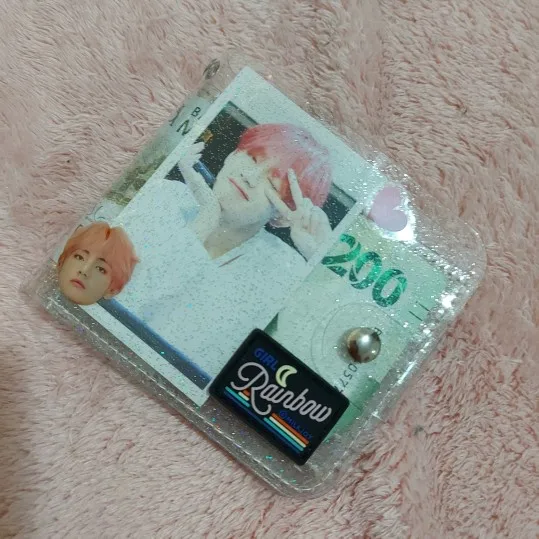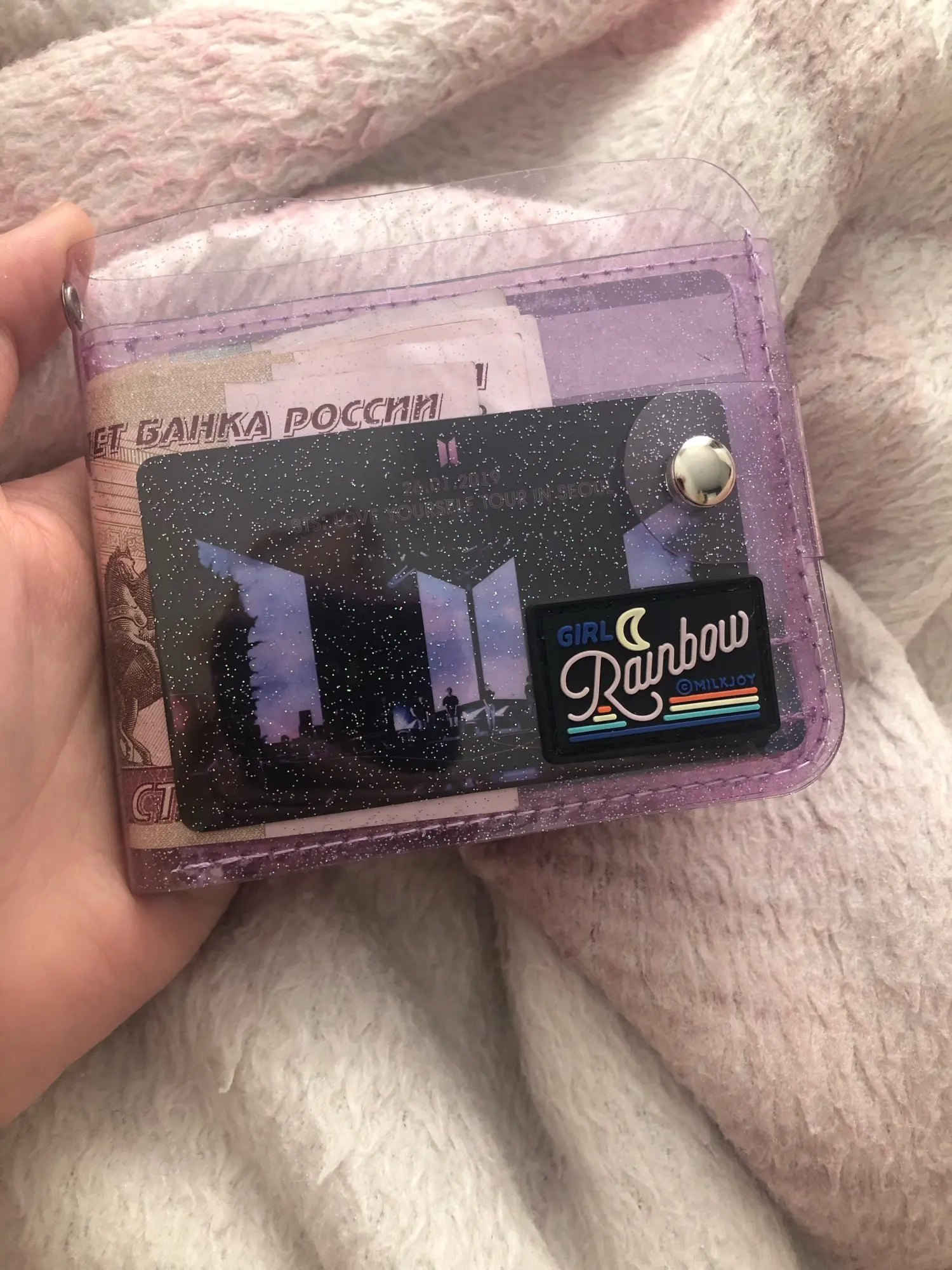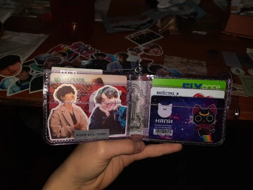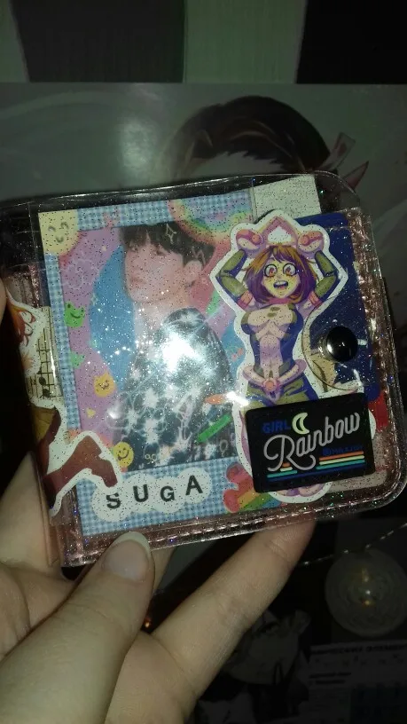 Ребята, это супер! Он очень красивый, и мне даже положили в подарок корейца, хаха! Я не шарю, но спрошу у кого-то из знакомых, кто он. :) Кошель крутой, туговат, но не страшно. Блёстки переливаются радугой, и это прям невероятно вау!