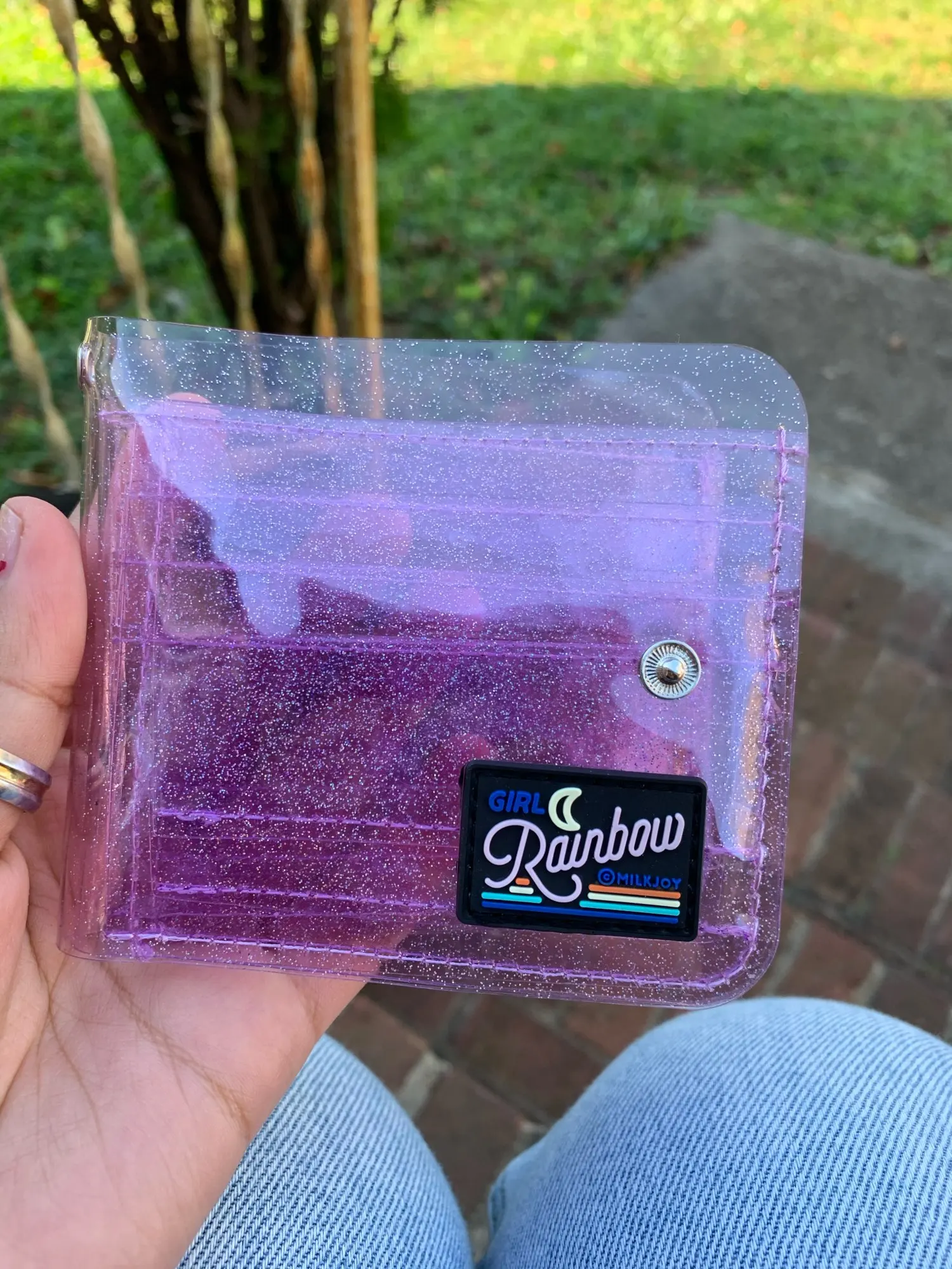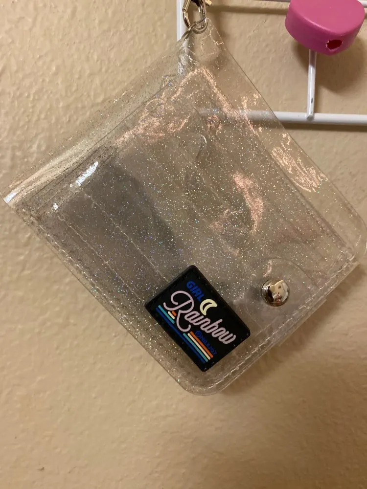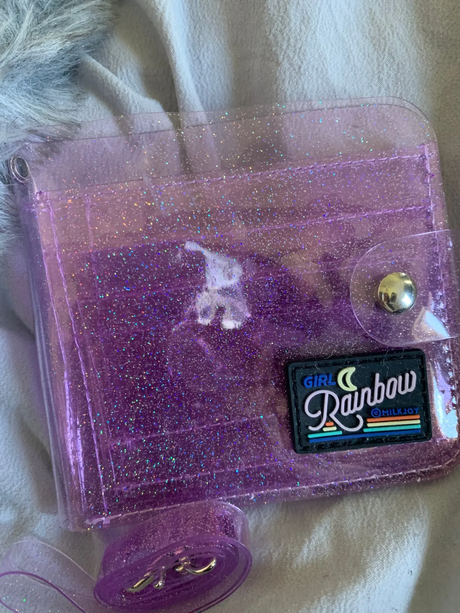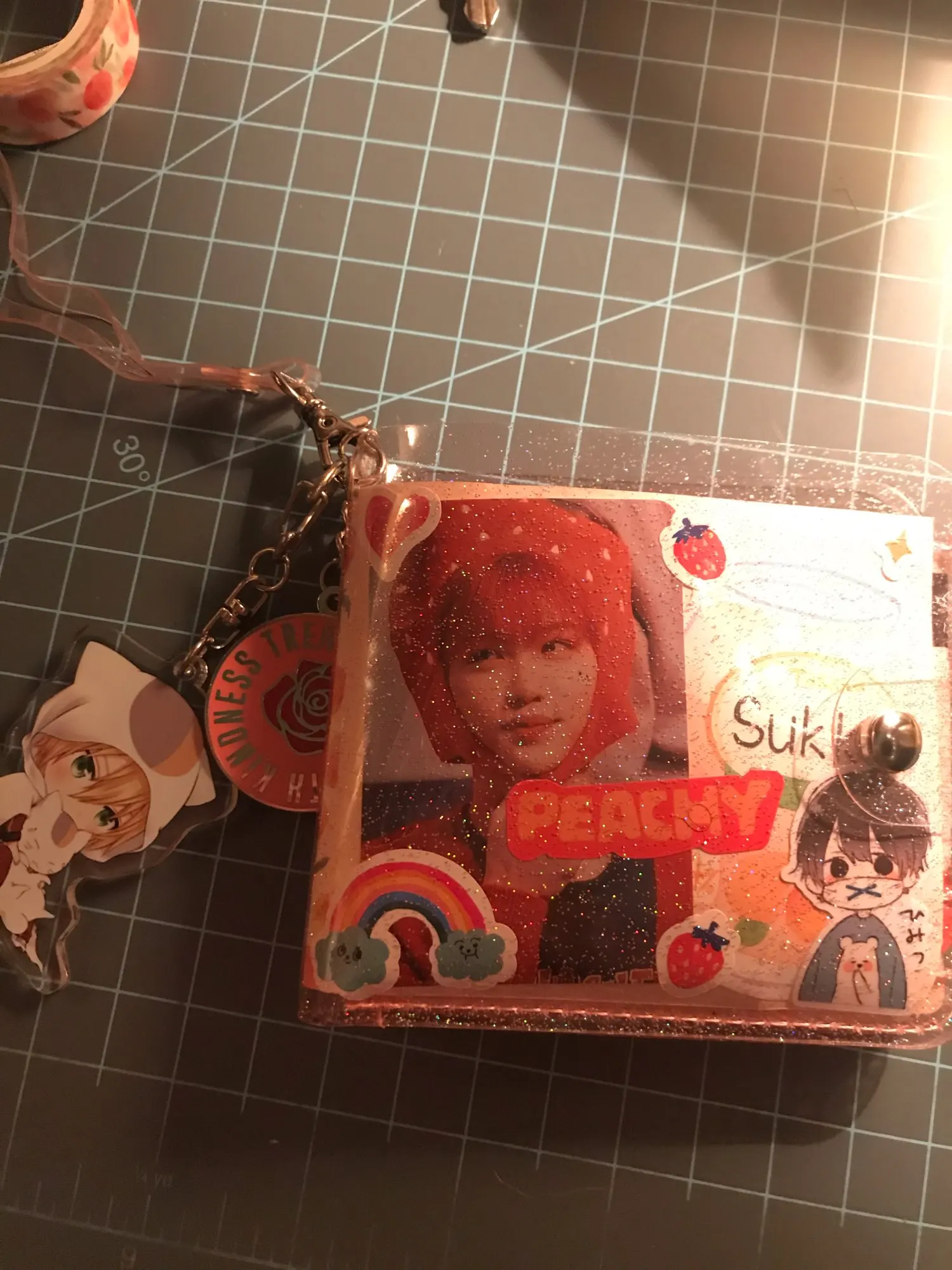 Ребята, это супер! Он очень красивый, и мне даже положили в подарок корейца, хаха! Я не шарю, но спрошу у кого-то из знакомых, кто он. :) Кошель крутой, туговат, но не страшно. Блёстки переливаются радугой, и это прям невероятно вау!