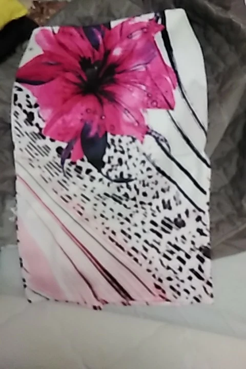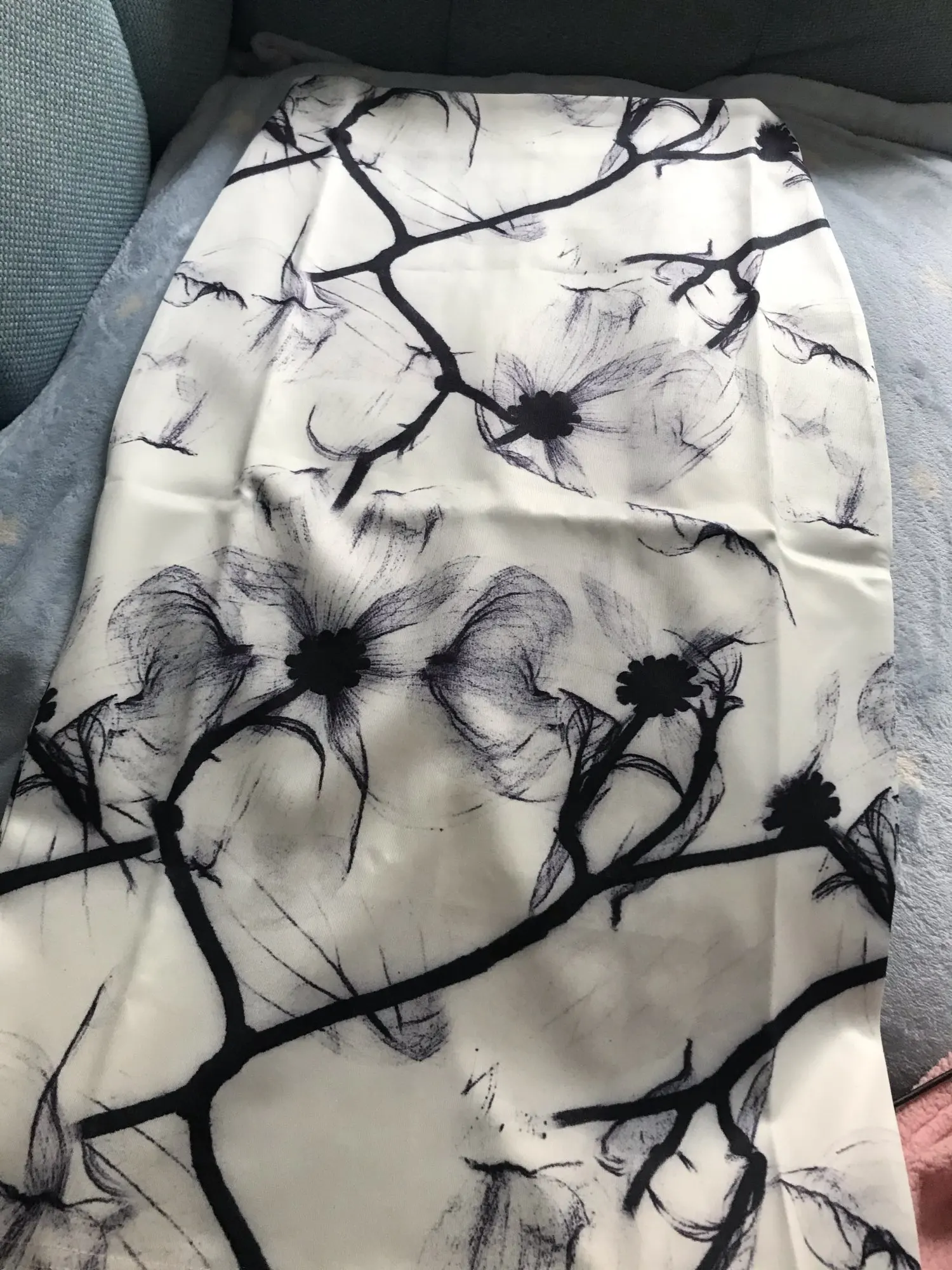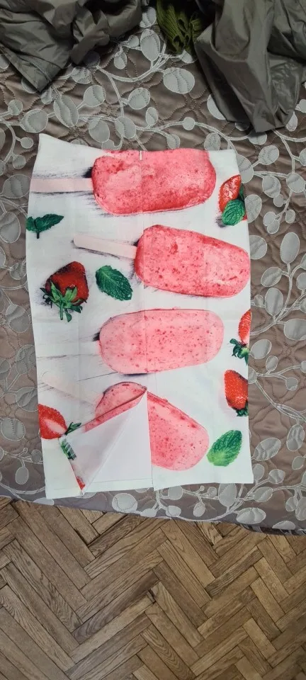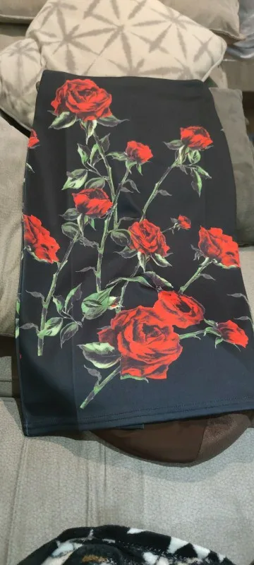 юбка пришла очень быстро.Материал плотный синтетический трикотаж ,рисунок чёткий , швы ровные .В прошлом году купила точно такую 2xl и ещё с нежными цветами , думала ,что на мой 46-48 будет хорошо , НО ОНИ УЖАСНЫЕ МАЛОМЕРКИ !!! У 2xl объём бёдер оказался 88см ! Вот пришлось заказать ещё 2 шт , чтобы уже из 4 собрать 2..., благо , что сама умею шить .