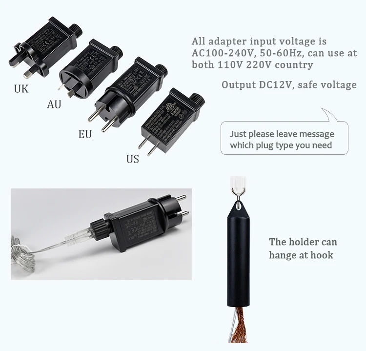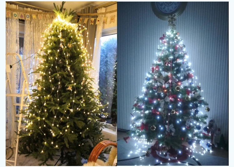 Спецификация: 2 м 15 ветка 300LED2 м 30 ветка 600LED3 м 15 ветка 450LED3 м 30 ветка 900LED3 м 40 ветка 1200LEDЦвет света: теплый белый, многоцветныйВыходное напряжение: DC12V, подключается к адаптеруВходное напряжение: AC100-240V, штепсельная вилка США/Великобритании/Австралии/ЕС для опции, пожалуйста, оставьте сообщениеВодонепроницаемость: гирлянда IP65, адаптер IP44Сертификация: CE RoHS FCC