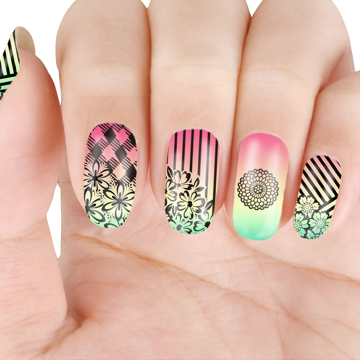Особенности:1. Нанесите Базовое покрытие или обычный лак на ноготь.2. Нанесите лак для ногтей на желаемое изображение в пластине. (Совет: используйте лак одного цвета, чтобы текстура была плотнее, чем у других лаков для ногтей)3. Поставьте скребок под углом 45 градусов и БЫСТРО снимите излишки лака, плотно прижимая скребок.4. Сразу прижмите штамп, немного провернув его, чтобы переснять рисунок. Изображение переносится на штамп.5. Отпечатайте изображение на ногте, немного провернув штамп. Изображение переносится на ваш ноготь.6. Повторите вышеописанные шаги на остальных ногтях.