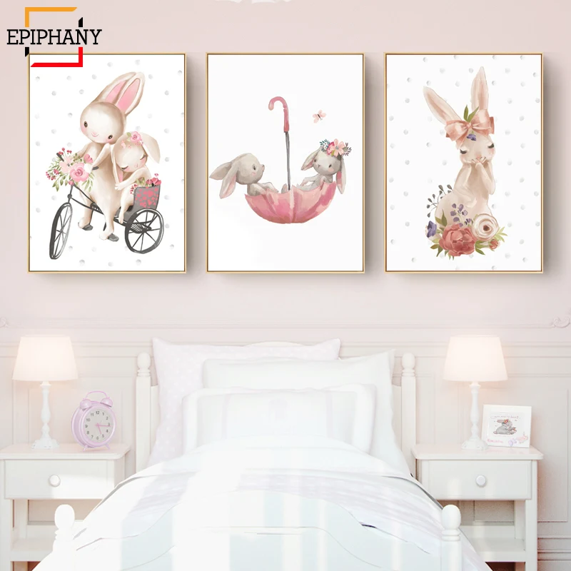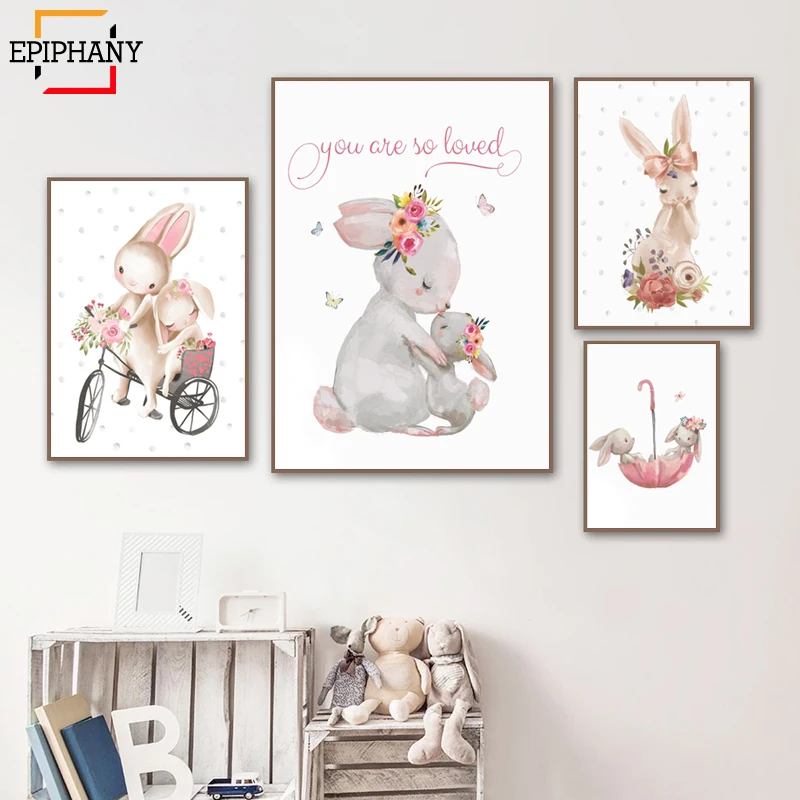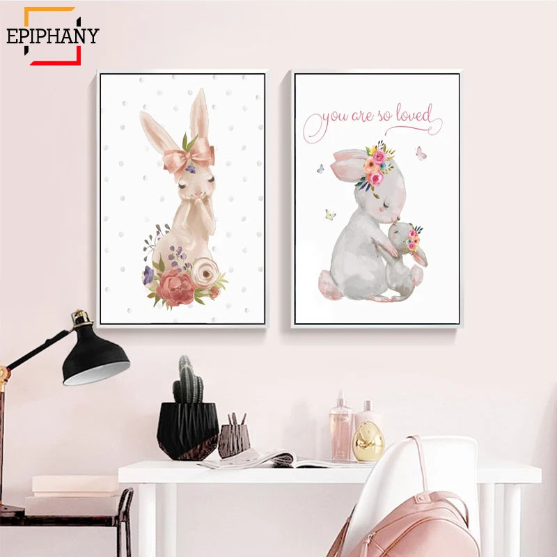 Цветочный принт в стиле бохо, Раскрашивание кроликом на холсте, милое мультяшное животное, декор для спальни