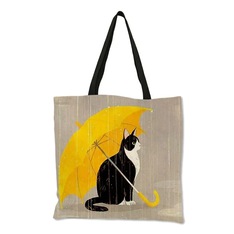 Сумка-тоут женская, из льна, с принтом в виде кошки