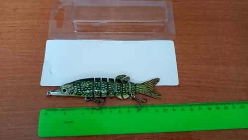 Две недели и рыбка прибыла в Вологодскую область. Упакована в пупырчатый пакет. Продавец положил с другими заказами в пакет. Рыбка хорошая. Все сегменты целые. Крючки острые. Проверим, как рыбка будет ловиться. Продавец хороший, отправил быстро. Заказываю не первый раз.