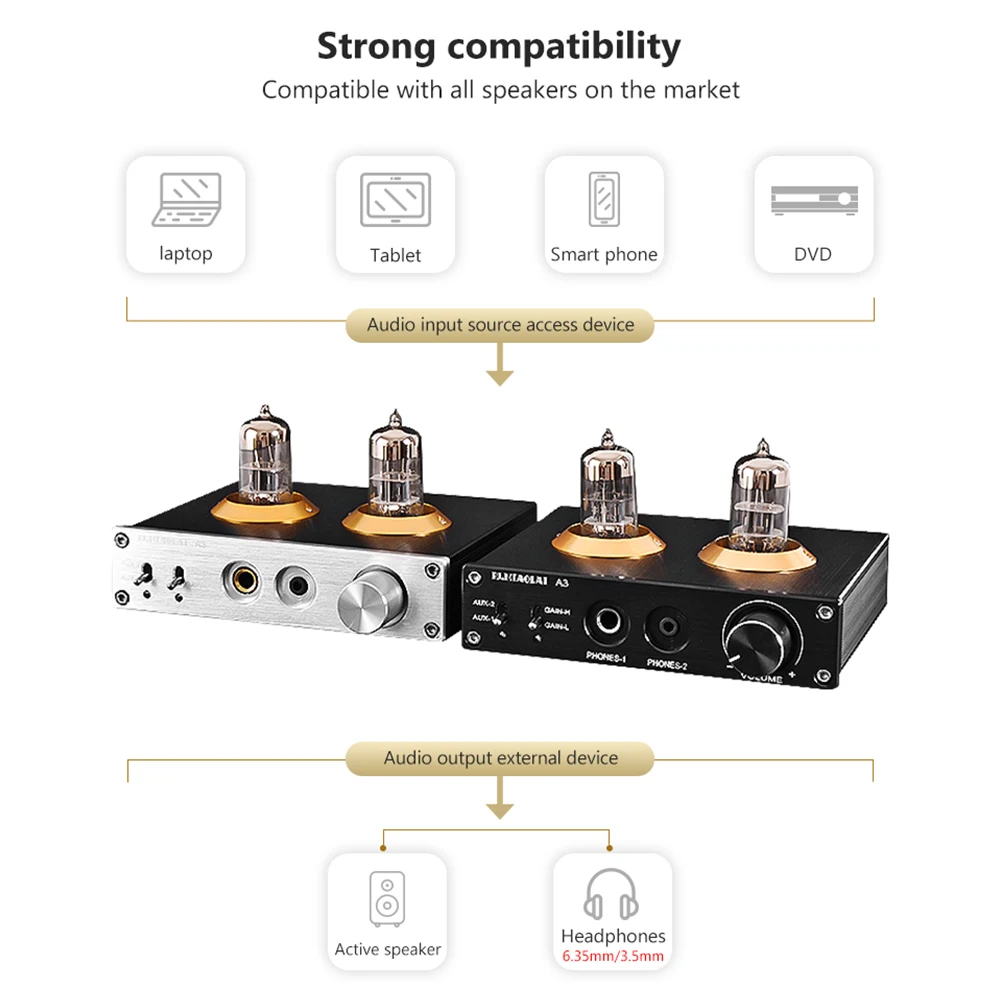 A3 два набора входного аудиосигнала, с аудиовходным переключателем, бесплатно переключать аудиовход. Независимо от того, подключен ли выход к вашим высококачественным наушникам, в части усилителя используется классический чип декодера аудио MAX9722, звуковое поле является глубоким и сильным, прозрачным и ярким. Он также используется в качестве настраивающего звука для подключения усилителя к усилителю. Мультимедийные динамики и другое аудиооборудование принесут вам удовольствие от реального HiFi уровня, настоящего bile.