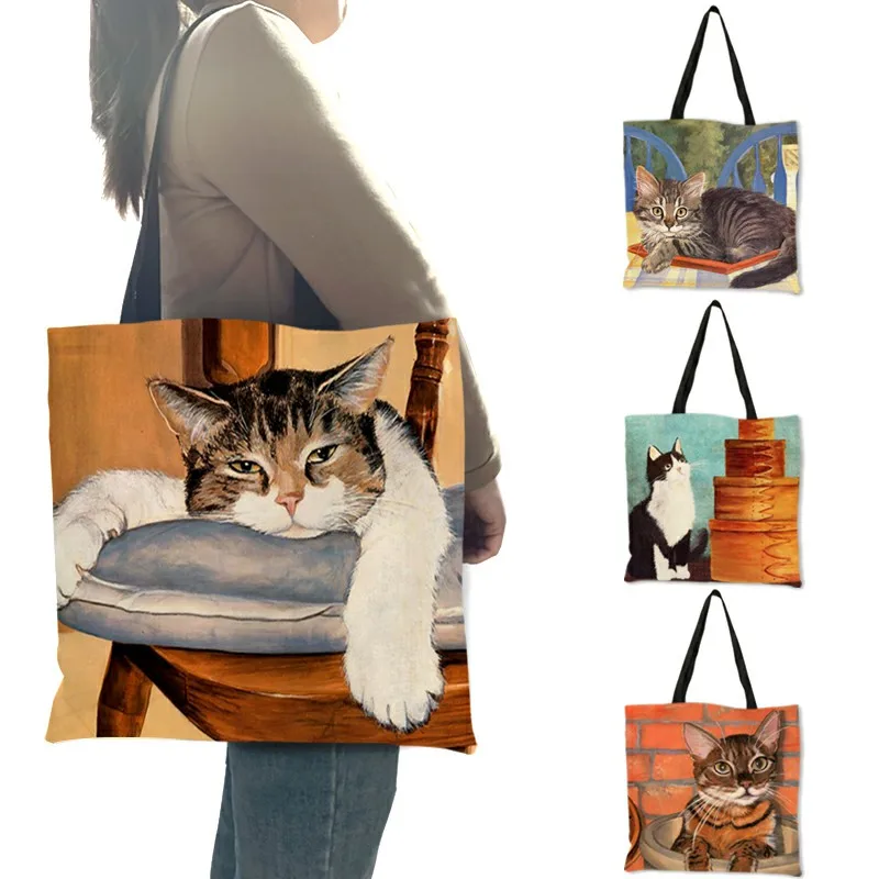 Экологичная льняная многоразовая сумка для покупок с масляной кошкой, женская модная сумка-тоут, сумки для студентов, дорожные школьные сумки