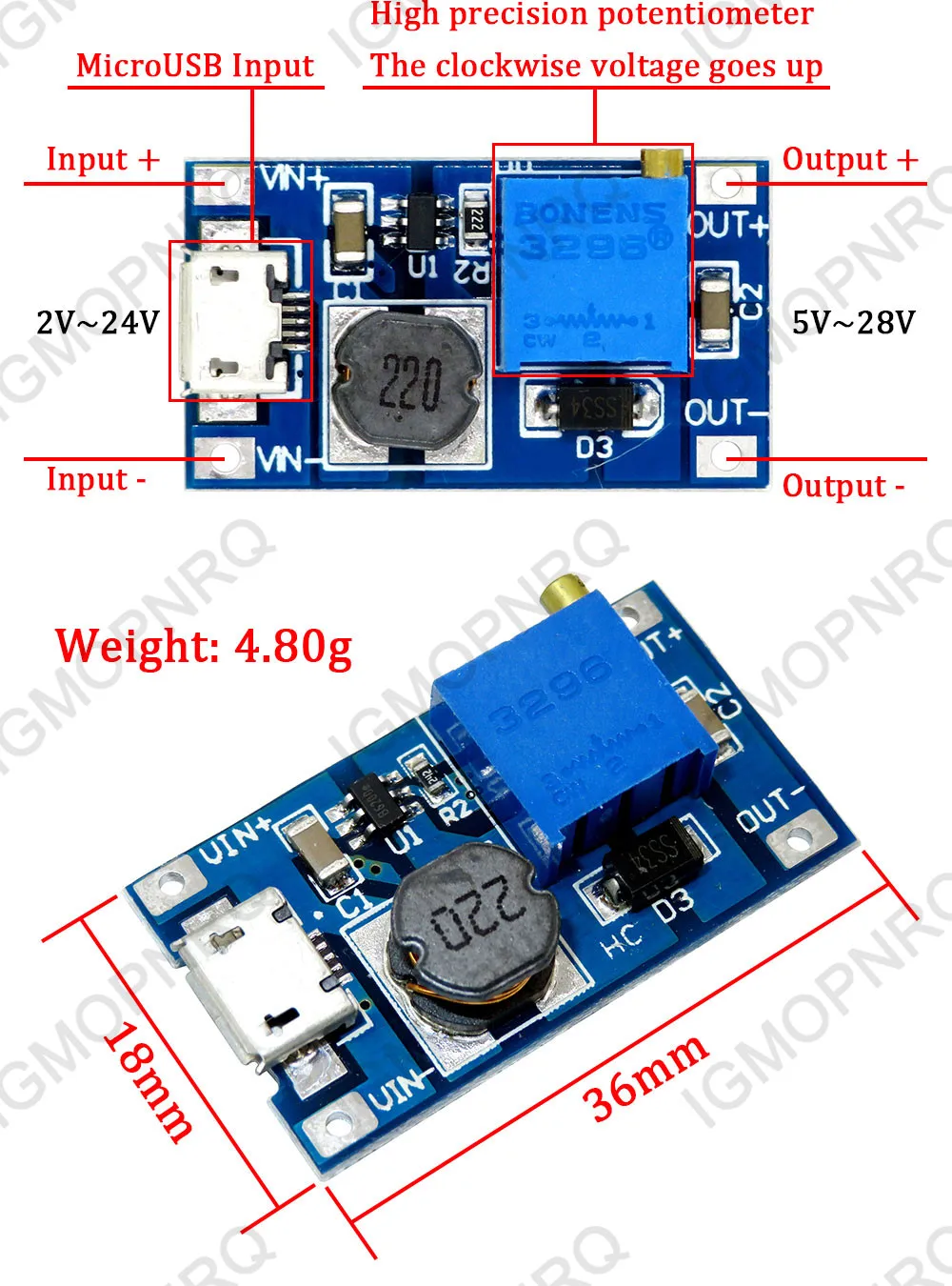 Регулируемый Повышающий Модуль MT3608 DC-DC, 2 А, Повышающий Модуль с MICRO USB 2 в-24 в до 5 В, 9 В, 12 В, 28 В, 1 шт.