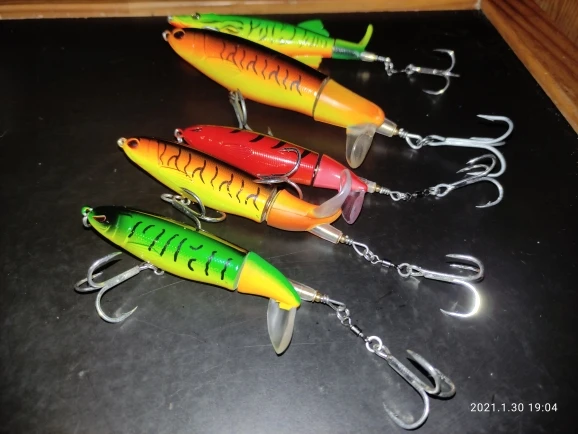 Планов вполне качественные. Крючки очень острые. Бело-красный Поппер по факту оказался прозрачно-красным, посмотрим как будет ловить. Есть минус, на мой взгляд - передняя петля и задняя не одно целое. Они отдельны и крепятся внутри тела рыбки петлей за пластиковые перемычки. На прозрачном Поппере хорошо видео. Насколько эта конструкция будет крепкой посмотрим.