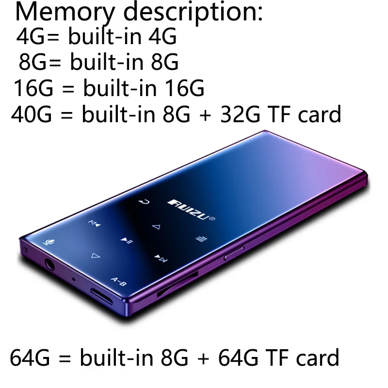 Корпус: корпус из магниевого сплаваДисплей: 1,8 дюймаРазрешение экрана: 126*160Размеры: 94*40*9 ммПамять: 8 ГбВоспроизведение фона музыки: ПоддержкаСинхронизация текстов LRC: ПоддержкаA-B Повтор: ПоддержкаРежим воспроизведения: повторное воспроизведение, одиночное воспроизведение, все циклыФункция TF-карты: Поддержка карт памяти макс. 128 ГБВоспроизведение с переменной скоростью: 16 смещенийВидео: Поддержка видео в формате AVI. Перед воспроизведением обычного видео необходимо преобразовать с помощью видеоконвертера. Мы предоставим видеоконвертер.Громкоговоритель: ПоддержкаФункция радио: Поддержка. Поддержка записи FM-радио.Будильник: поддержка.Секундомер: ПоддержкаЧтение текста: Формат TXT, поддержка закладокАккумулятор: полимерный аккумулятор 400 мАФункция записи: Поддержка записи с микрофонаСрок службы: 30-65 часов воспроизведения песен в состоянии заставки наушников. Видео воспроизводится 3-7 часов.Язык: поддержка 20 языков. Английский, русский, итальянский, иврит. Японский, корейский. Испанский. Немецкий и т. Д.Аудиоформат: APE, AAC, FLAC, MP3, WMA, OGG. Посылка:1 mp3-плеер1x проводные наушники (у 4G плеера нет наушников.)1 USB-кабель1 Руководство пользователя