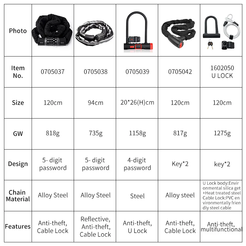U замок:Материал: корпус замка: экологичный силикон + Термообработанная стальРама замка: высококачественный АБС-пластикРазмер: 125*150 ммКабельный замок:Материал: ПВХ экологически чистый стальной кабельРазмер: диаметр: 12 ммДлина: 1200 мм