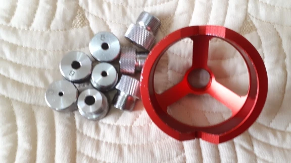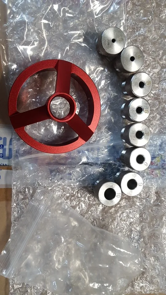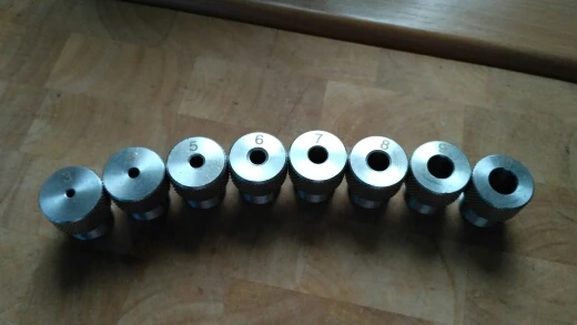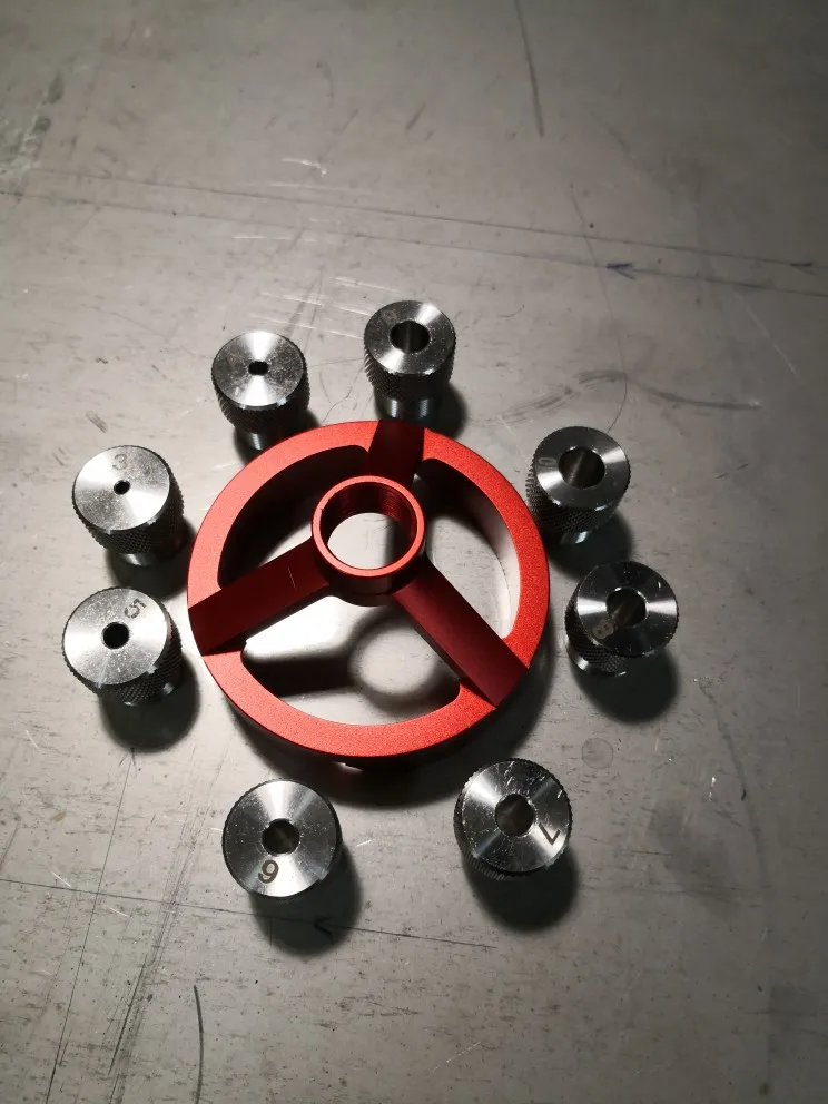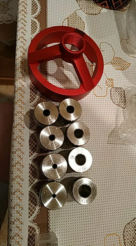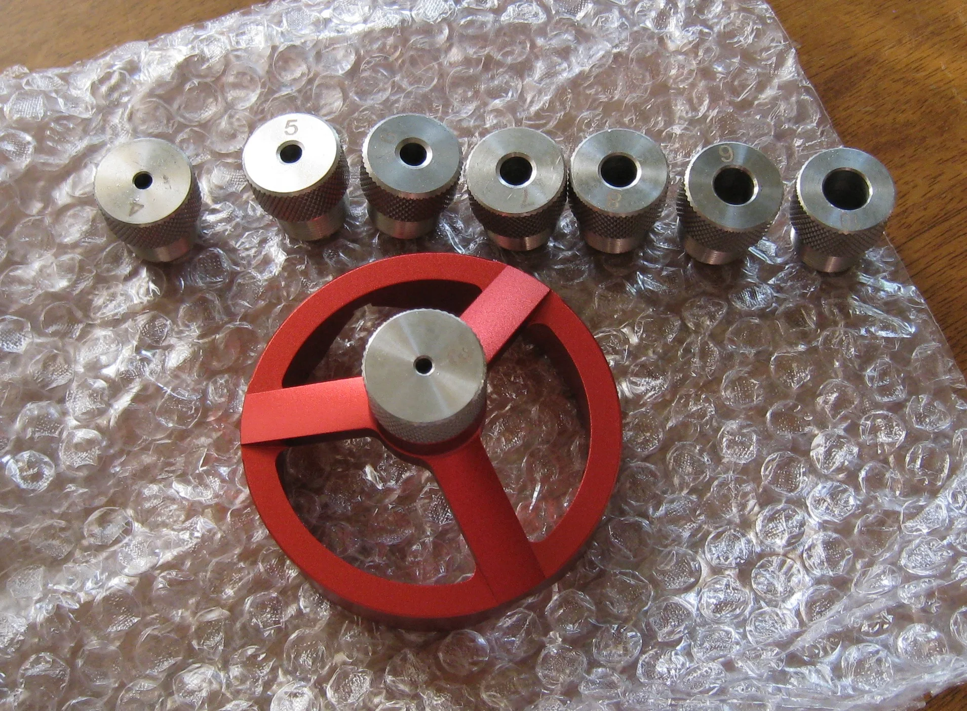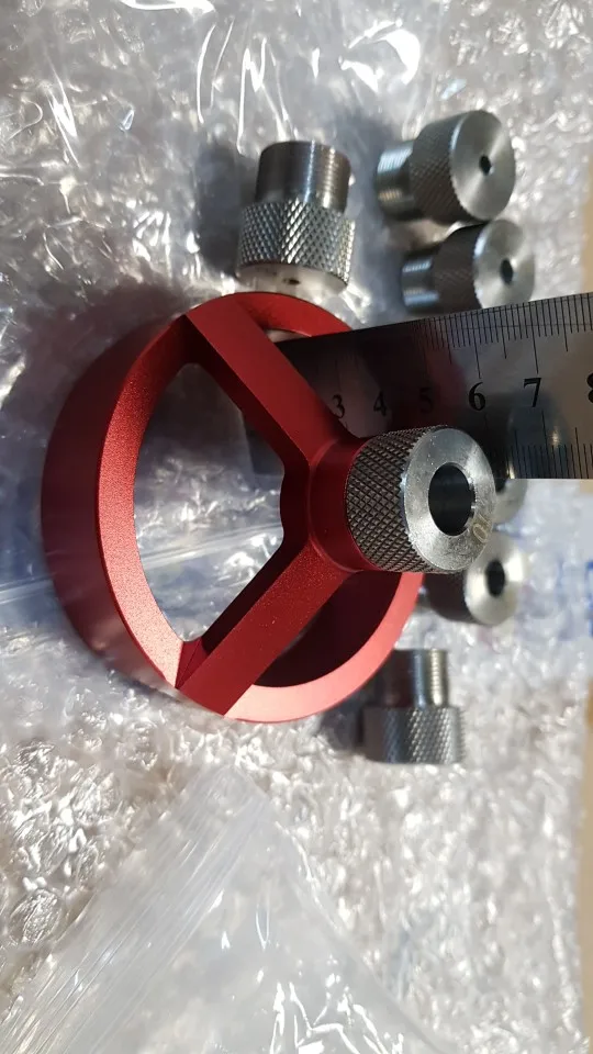 Превосходный кондуктор! Всё соответствует фото и описанию. Сам кондуктор из алюминия, ровный, сделан аккуратно, наружный диаметр D 78 мм. Высота кондуктора с вкрученной втулкой 60 мм. Имейте ввиду, понадобятся длинные свёрла! Втулки стальные, сделаны хорошо и аккуратно. Отверстия во всех втулках по центру, диаметры точные, свёрла не болтаются. Фаски сняты, накатка качественная. Маркировка нанесена не краской, а лазером или травлением. Наружный диаметр резьбы втулок 18 мм. Вес кондуктора 88 грамм, вес всех втулок 400 грамм. Упаковано хорошо, во вспененный полиэтилен и пузырьковую пленку. Заказ прибыл на почту в Москву за 14 дней. Мелкий недостаток: красное покрытие на алюминиевом кондукторе легко царапается. Рекомендую этот товар и магазин.