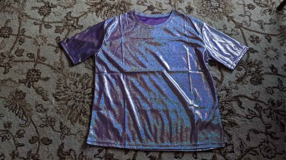 Футболка очень синтетическая, тонкая (это исправляется кондиционером и антистатиком). Не просвечивает. Но зато очень блестящая! Это восторг! На ОГ 78, ОТ 60, рост 165 - очень свободная и длинноватая. В заправленном или подвязанном виде смотрится супер. Для ежедневной носки вряд ли. Брала именно на выход. Пришла в срок. С продавцом не общалась.