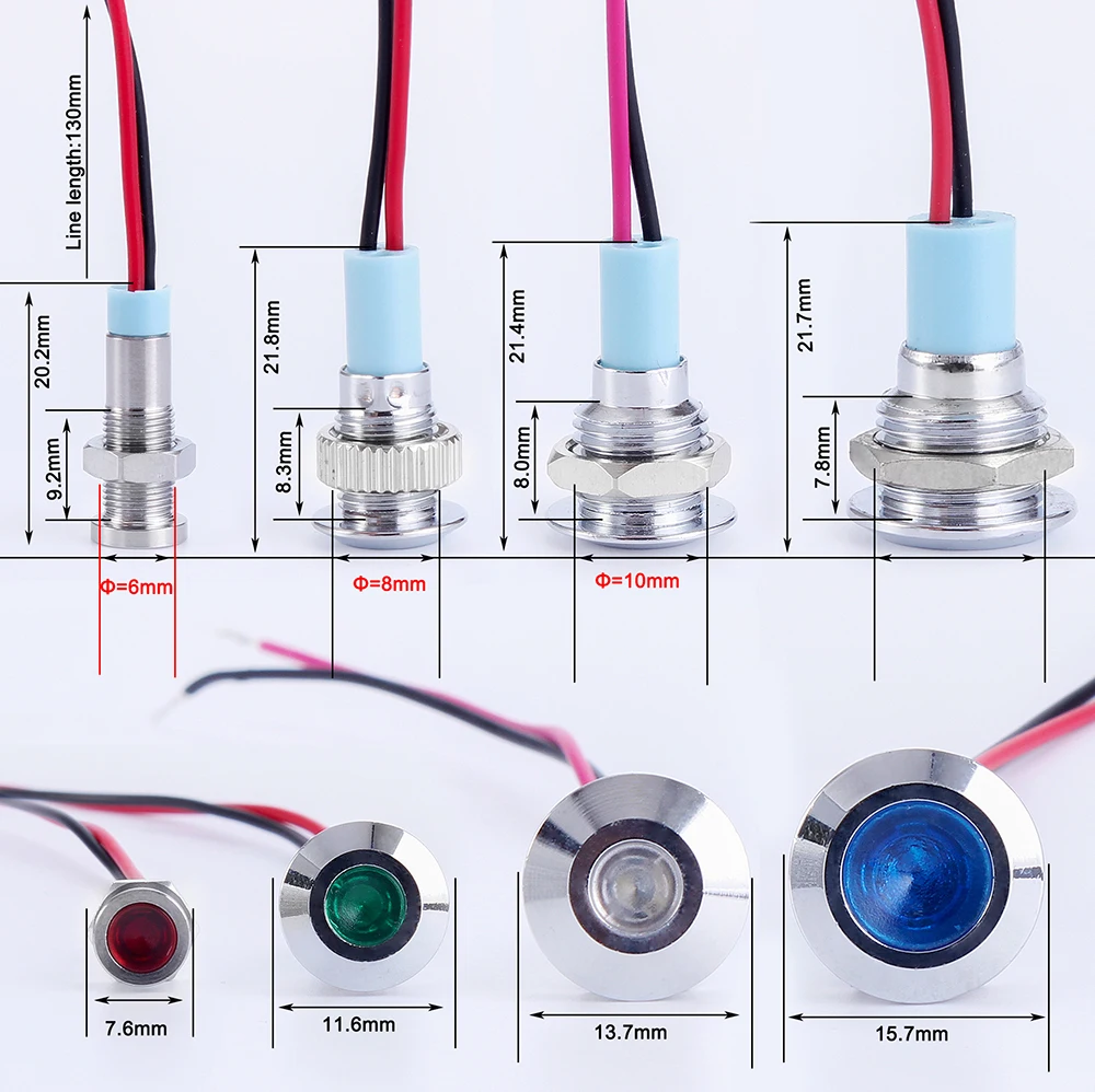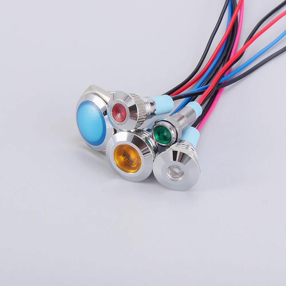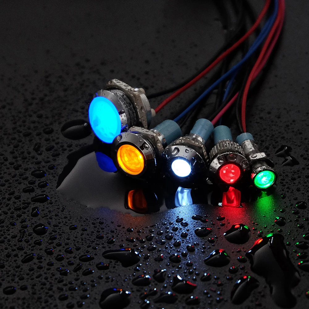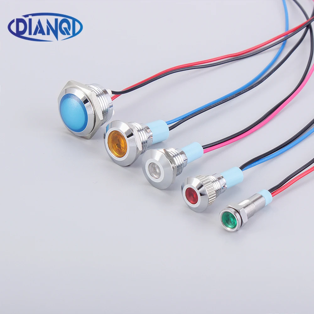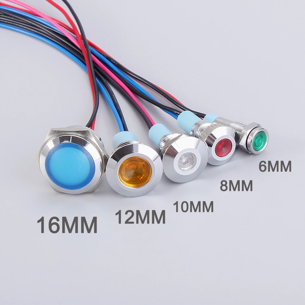 Металлический светодиодный сигнальный индикатор, 6 мм, 8 мм, 10 мм, 12 мм, 16 мм, водонепроницаемый IP67 сигнальный светильник, сигнальная лампа, переключатель с проводами, 3 в, 5 В, 12 В, 220 В, красный, синий