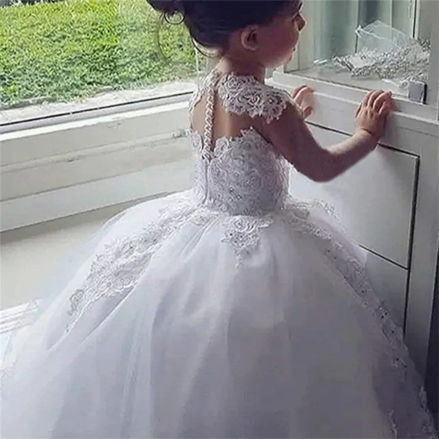 Платье для девочек, с длинным рукавом, с цветочным принтом, с аппликацией и бисером, белое