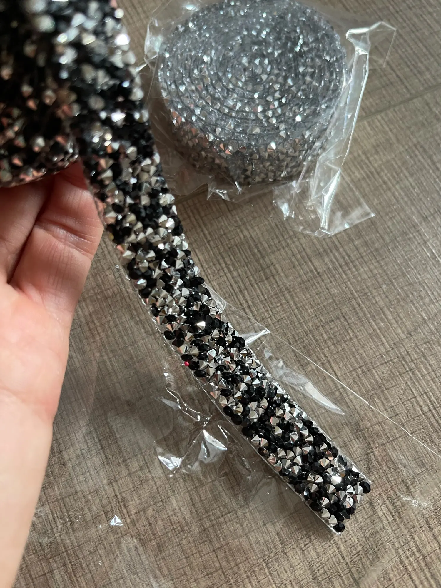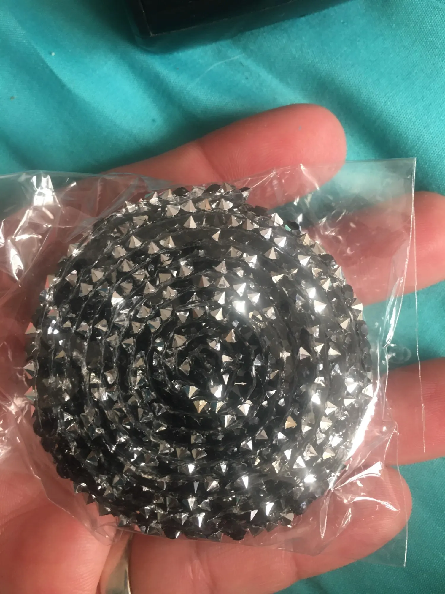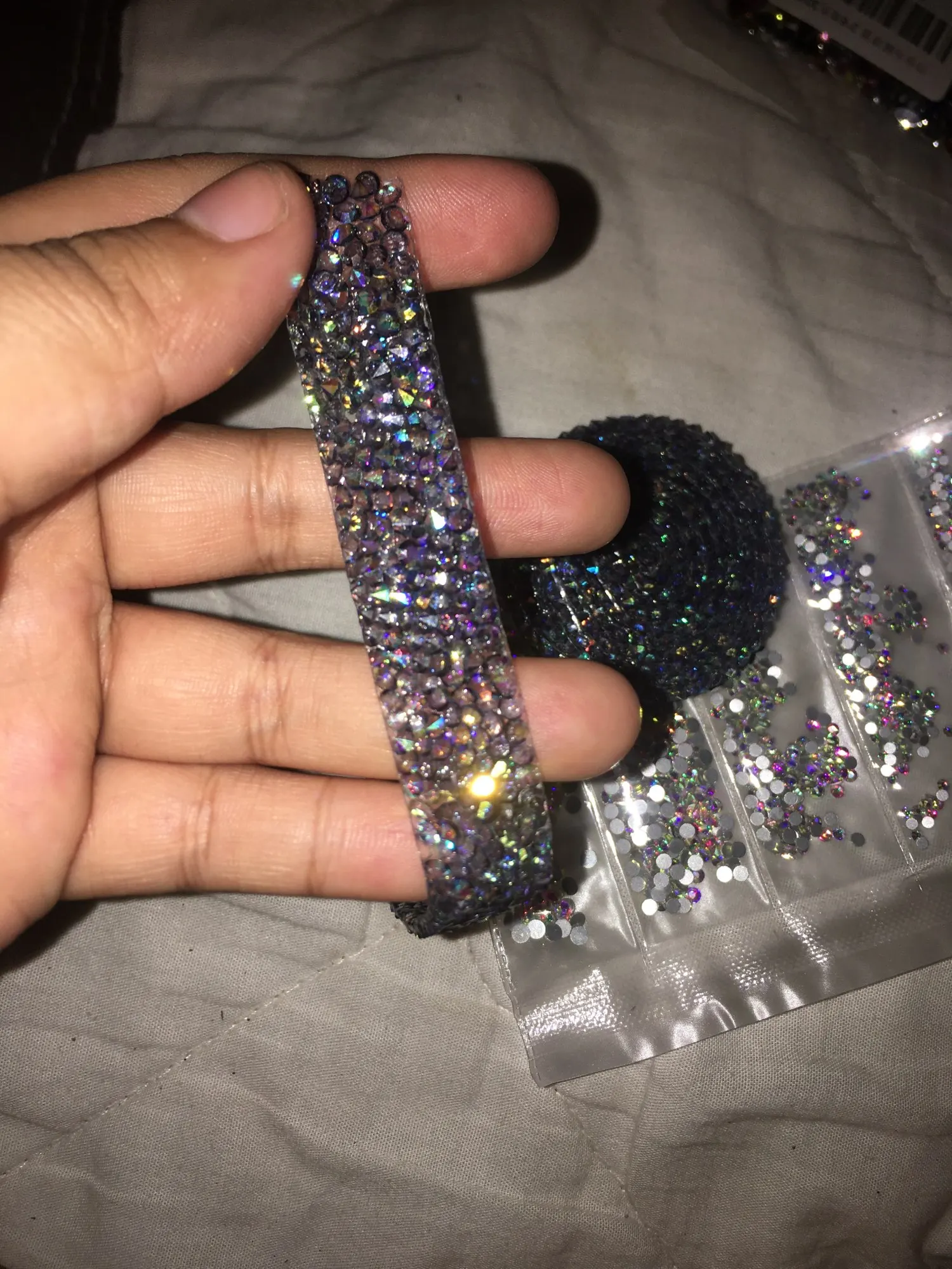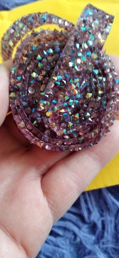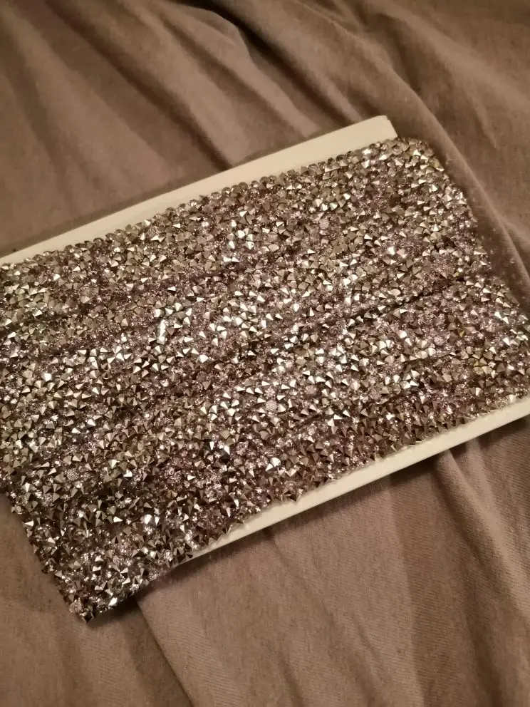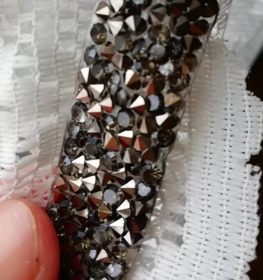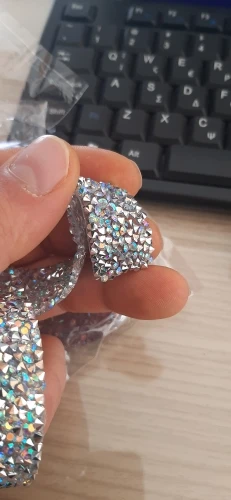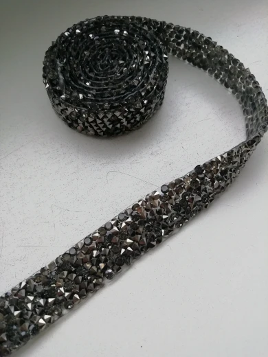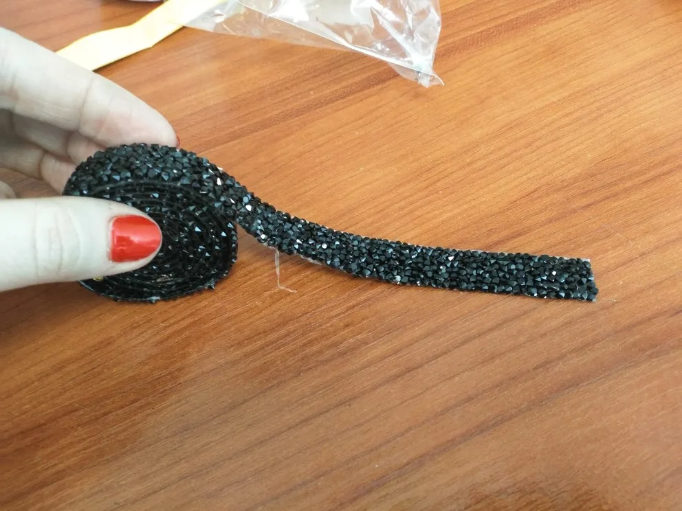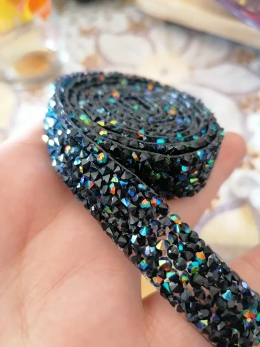 Хорошая лента, ещё не использовала, думаю, будет очень удобно. Она на толстой клеевой основе, то есть камушки утоплены в клееву полоску. Можно разрезать по своему желанию, если, к примеру, понадобятся элементы неправильной формы. Основной блеск придают золотистые биконусы, черные камушки не такие яркие, замечаю легкую мутность от клея, но это придирки. Отличный товар, хороший ассортимент у магазина