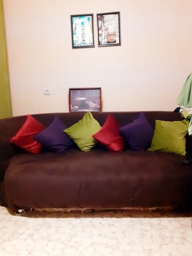 Пришла довольно быстро наволочка, заказывала зелёную. На фото вблизи видно - после стирки полосы, волокна замялись и не разглаживаются(( Фиолетовую тоже заказывала на али, но у другого продавца, такого нет и после стирок всё ок. Поэтому немного разочарована качеством, хотя хотелось именно такой цвет.