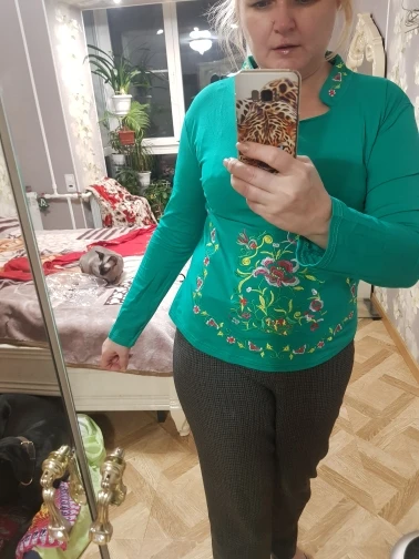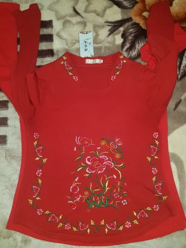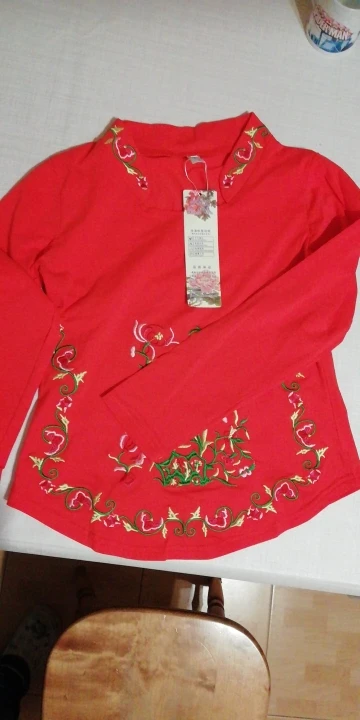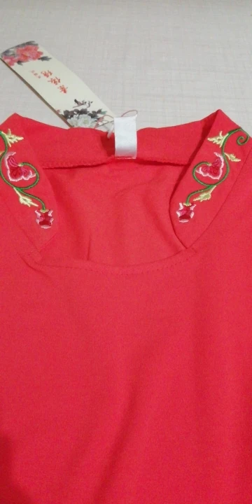 Блузка очень красивая, вырез свободный, не под шею, как мне нравится. Часть вспомогательной бумаги для вышивки была оставлена на неправильной стороне, она, конечно, отклеивается во время стирки (я не оторвал вручную, Я боюсь сломать нитки), я надеюсь, что он не прилипает ко всем вещам и не сломает мою стиральную машину. Цвет и внешний вид полностью совпадают, размер подходит, так что в целом я доволен. Я добавлю фото после стирки