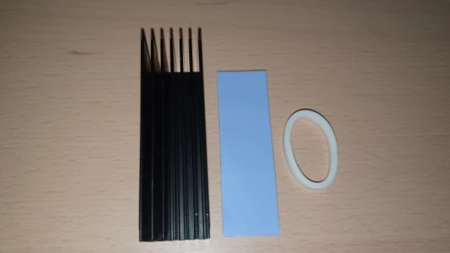 в комплекте радиатор, 2 резинки, термо-клейкая лента, мой SSD samsung 970 evo plus с 50+ градусов в нагрузке стал 36-37 градусов. Очень быстрая доставка - 1-2 недели