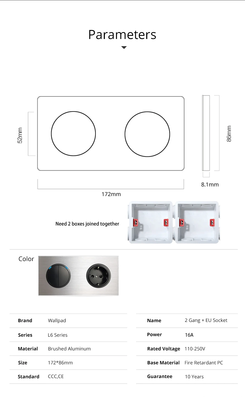 Wallpad L6 серии2 Выключатель двойной выключатель света с ЕС настенная электрическая Силовая розетка серебристая алюминиевая панель из сплава двойная пластина, 172*86 мм
