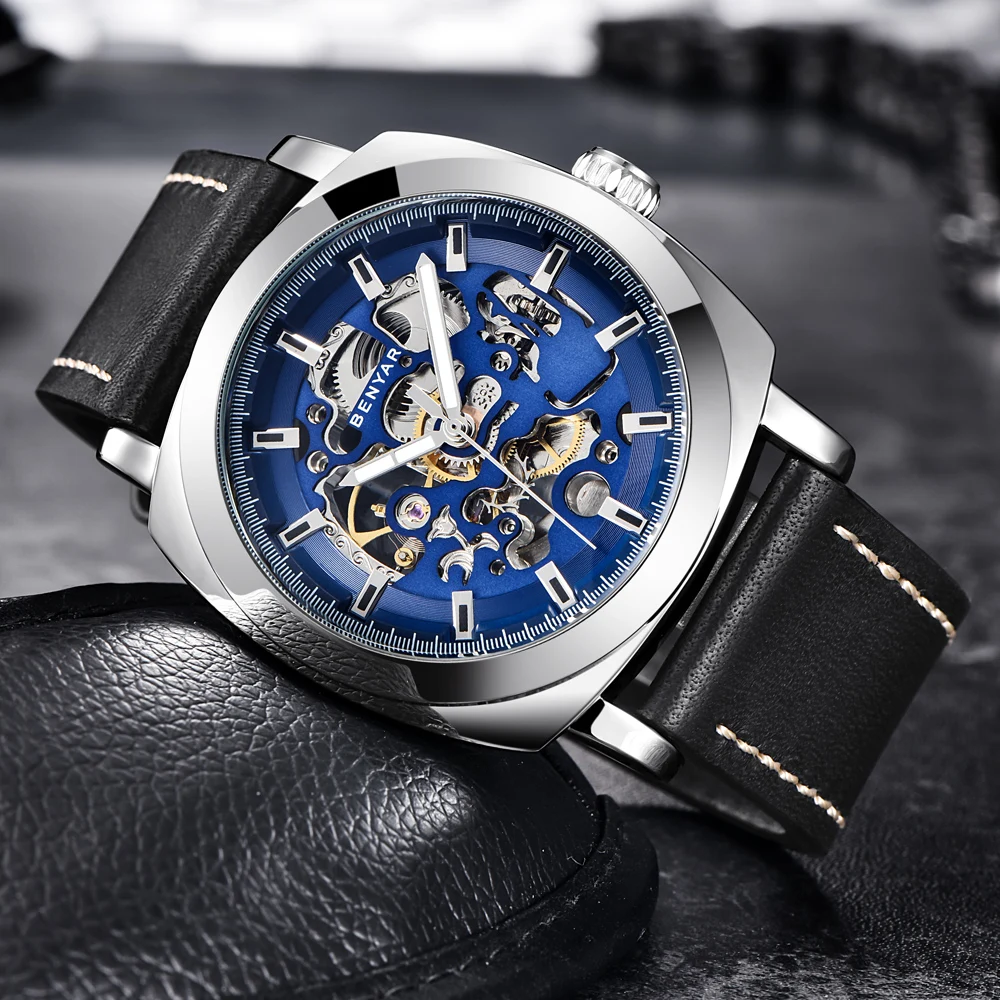 Комплект мужских часов BENYAR, автоматические механические водонепроницаемые спортивные часы с кожаным ремешком