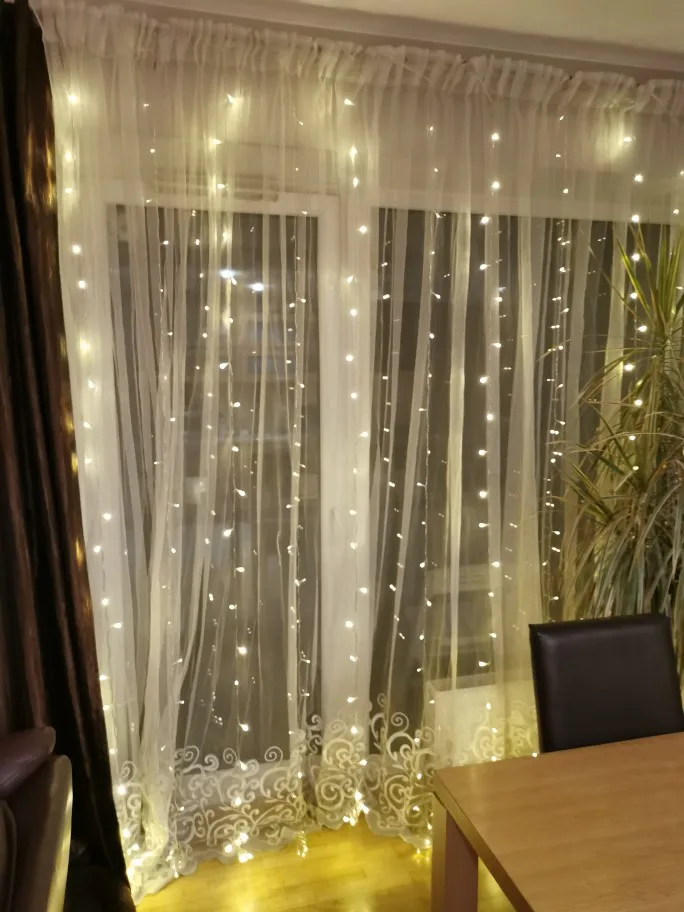 Отличный занавес. Украшает и создаёт поистине праздничное настроение. Есть режимы свечения, лично мне по душе постоянное свечение, без мигания. Возможно продолжение занавеса, так как на противоположном его конце, где расположена вилка, есть розетка. Гирлянда качественная. Рекомендую.