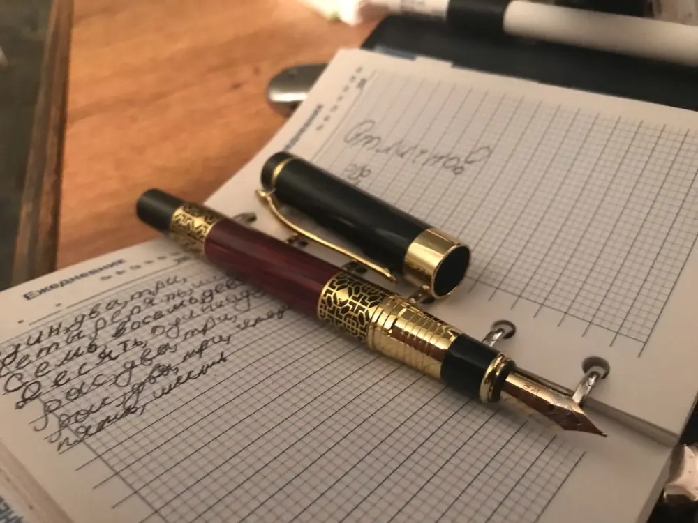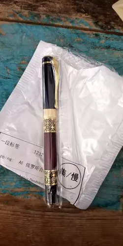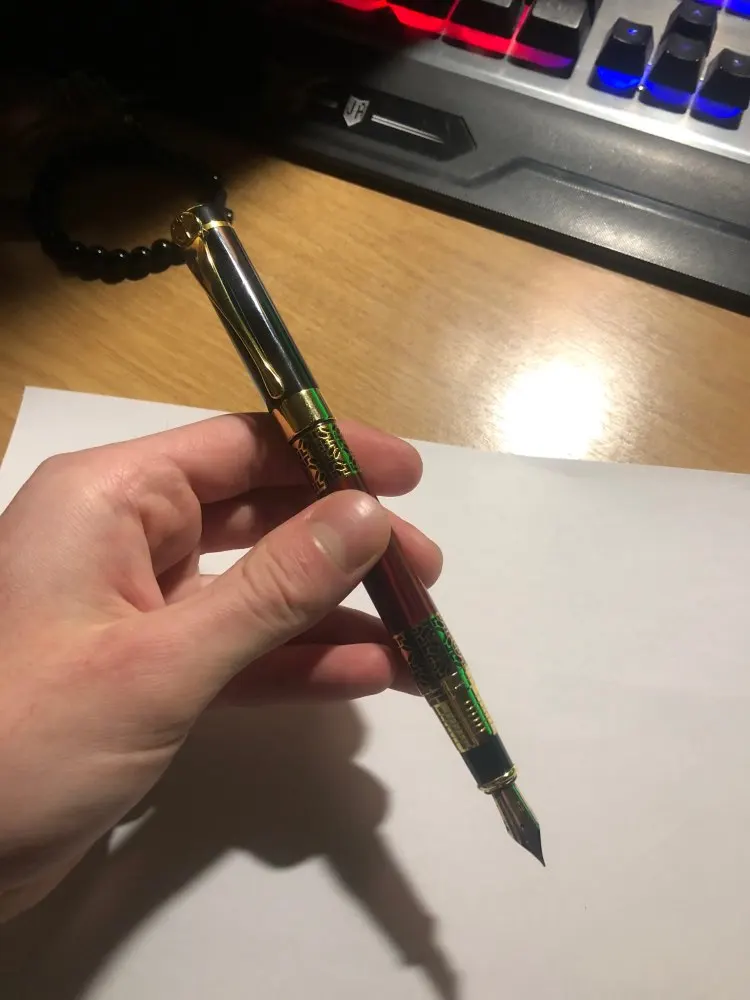 Ручка бомбезная за 2$ это просто пушка. Заказал 4 ручки перьевые и эта по дизайну и по моему личному топу занимает второе место после полностью черной , но пишет просто лучше всех, ну или чуть хуже деревянной! Так что всем крайне рекомендую к приобретению. Сама ручка увесистая и дорого ощущается в руке . До Ульяновска шла 20 днейс