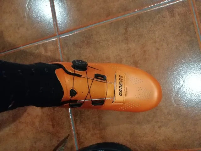 Измерил стопу стоя и заказал размер 43 с дополнительным пространством 3 мм. Обувь, похоже, немного меньше, чем указано в таблице размеров. Мои пальцы на передней части обуви. Если честно говоря, я немного разочарован, но попробую и узнаю, могу ли я с ними заплести боль. Доставка в Италию занимает 3 недели