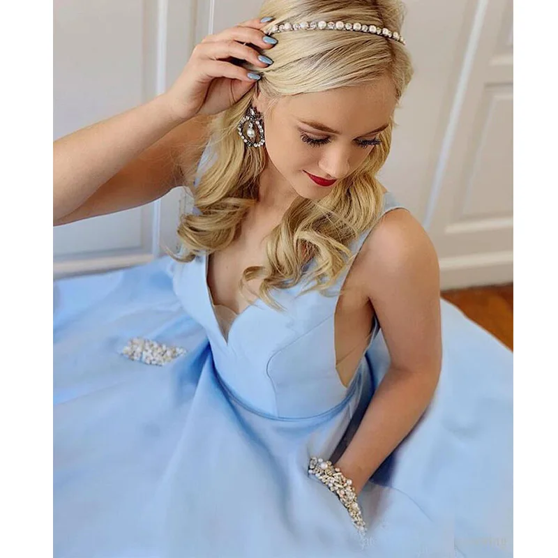 Светильник-голубое платье для выпускного вечера с карманами, ТРАПЕЦИЕВИДНОЕ вечервечерние платье с V-образным вырезом