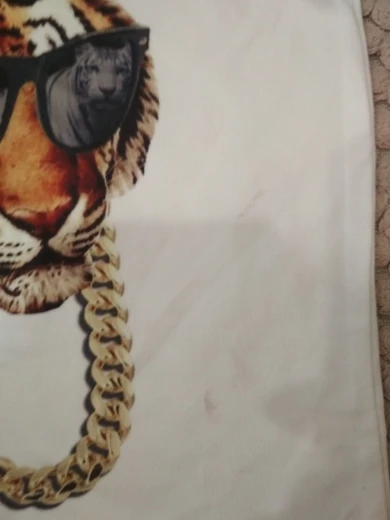 Плохая футболка. Состав нигде не указан. Печать блеклая. Есть пятна. На фото видно. После стирки так и остались. Доставка быстрая. Заказала 15 октября, получила 1 ноября. Денег своих - 314 р вещь не стоит. Возможно надену ребенку один раз, сфотографироваться на новый год, т.к будет год тигра. Для того и заказывала. С продавцом не общалась.