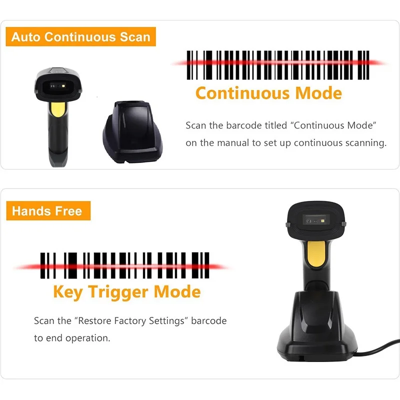 --- 1.【Magic Diamond система прицеливания и вибрационное оповещение 】 скорость чтения молнии в сочетании с большой глубиной поля не означает больше разочарования задержек, пытающихся получить ваш сканер под прямым углом или на расстоянии. В дополнение к зуммеру и светодиодный светильник, когда сканирование успешно, вы получаете тактильный сигнал в виде легкой вибрации. Зуммер может быть установлен для отключения звука, чтобы обеспечить спокойную работу.--- 2.【Versatile 3-в-1 Transmission】The штрих-код может работать через 2,4 ГГц беспроводной + USB 2,0 проводной. Он также совместим с Bluetooth. Поддерживает Windows и Mac OS; Работает с QuickBooks, Word, Excel, Novell; И почти всеми распространенными программными средствами. Его можно широко использовать в супермаркетах, торговых центрах, косметических магазинах, розничной промышленности, почтовой промышленности, логистике, банках и медицинских институтах.--- 3. 【Большой аккумулятор 2000 мАч, 60 дней в режиме ожидания 】большой встроенный аккумулятор 2000 мАч, время работы в режиме ожидания может превышать 60 дней. Непрерывное сканирование время может быть до 16,5-19,5 часов при полном заряде. Не беспокойтесь после одной зарядки.--- 4. 【Ударопрочный силиконовый дизайн 】яркий оранжевый силиконовый защитный чехол может избежать царапин и трения при падении с вашего стола или полки. Использование ярко-оранжевого цвета также увеличит визуальное изображение сканера штрих-кодов, когда вы не используете или не оставляете его в любом месте.--- 5. 【Поддерживаемые цифровые и печатные 1D 2D кодовые обозначения: 1D: кодабар, код 11, коде93, MSI, код 128, UCC/EAN-128, код 39, EAN-8, EAN-13, UPC-A, ISBN, Industrial 25, interleaved 25, Standard25, Matrix 2D: QR, DataMatrix, PDF417, Aztec, Hanxin, Micro PDF417. Он может считывать штрих-код, отображаемый на мониторе компьютера.