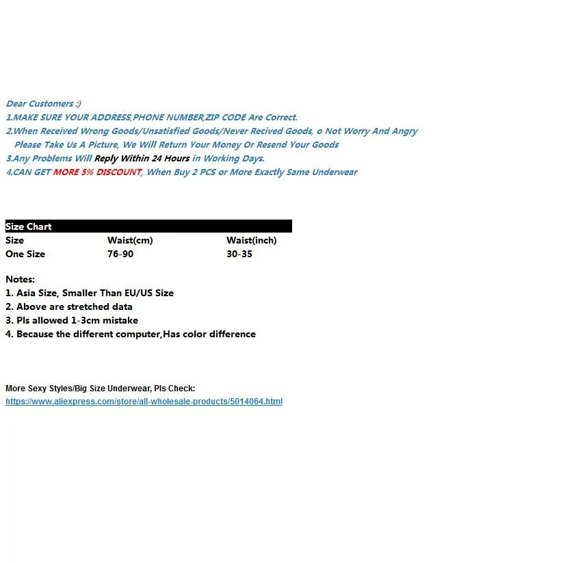 4. Можно получитьБолее 5% скидкаПри покупке 2 предметов и более одинакового нижнего бельяТаблица размеровРазмерыТалия (см)Талия (дюймы)Один размер76-9030-35Примечания:1. Азиатский Размер, меньше, чем размер ЕС/США2. Выше указаны данные о растяжении3. Допускается погрешность в 1-3 см4. Из-за разницы в настройках компьютеров цвет может отличаться