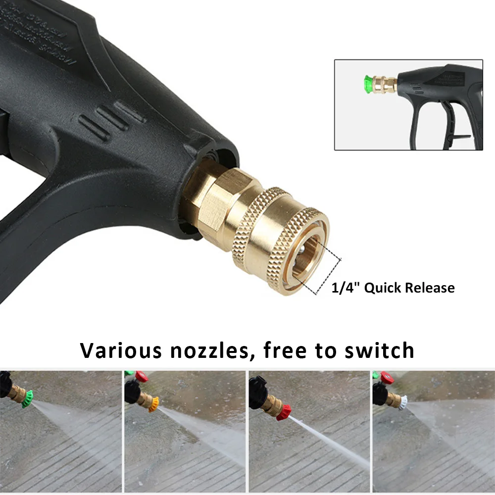 Характеристики: • На 100% абсолютно новый состояние и высокое качество • Тип: моечный пистолет высокого давления • Материал наконечника: медь и пластик • Расстояние распыления: 10 м • Рабочее давление: 2175 PSI / 150 бар/15 МПа • Диапазон давления: 2000 - 5000 psi • Емкость бутылки: 1000 мл (1 л) • Максимальная температура воды: 60 °C (140 °F) Особенности: • Корпус и пластина изготовлены из прочного и долговечного инженерного пластика. • Это бессенсорная мойка автомобиля, это экономит ваше время и энергию. • Густая пена suds расплавляет стержни и пачкается на краске, тем самым уменьшает вихревые следы и царапины. • Быстро установить разъем, легко установить и использовать. • Регулируемая Распылительная насадка для точного смешивания и образования пены. • Многократное использование: мойка автомобилей, мотоциклов, мытье окон, подъездные пути, крыши, сайдинг мойка и так далее. Идеально подходит для энтузиастов или профессионального использования. Не подходят для садового шланга. Комплектация: • Распылительное сопло-5 шт. • 1 пистолет для мойки автомобиля • 1 x пенная насадка с быстрым выпуском 1/4 дюйма Примечание светильник вая съемка и различные дисплеи могут привести к тому, что цвет товара на изображении немного отличается от реального. Допустимая погрешность измерения составляет +/- 1-3 см.
