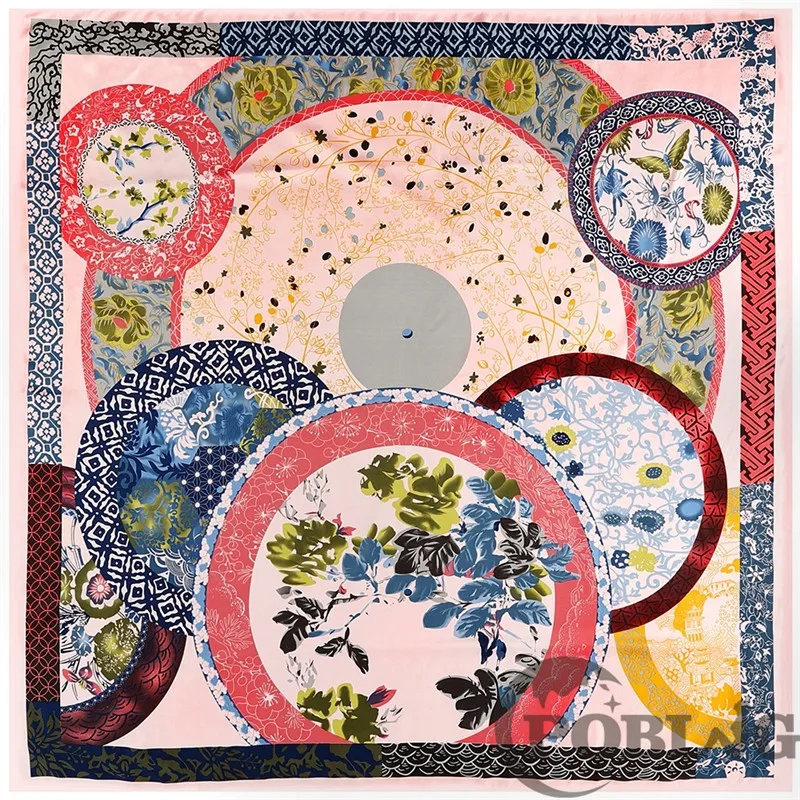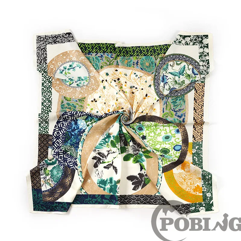 POBING 100% шелковый шарф, женские Большие шали, круглые палантины с цветочным принтом, квадратная бандана, испанский платок, женский шарф, 130 см