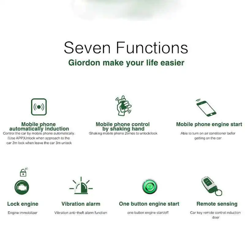 1. Одна кнопка для запуска/остановки двигателя. 2. Может быть подобран к вашей автомобильной системе сигнализации или БЕСКЛЮЧЕВОЙ системе входа. 3. Подходит для всех видов автомобилей. 4. Легко устанавливается и снимается. 5. Хорошее использование и безопасность анти-теф