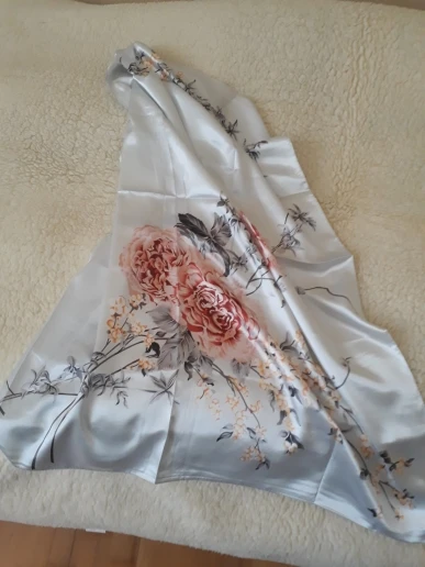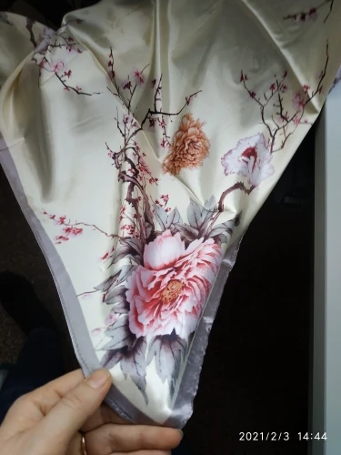 Получила платок. Расцветка замечательная. Нежный и красивый принт. Заказ доехал за 2 недели. Очень довольна. Спасибо продавцу. Попозже закажу ещё платки и других расцветок.