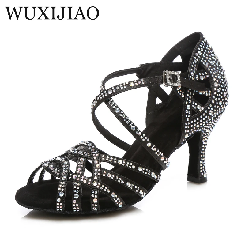 Туфли WUXIJIAO женские для бальных танцев, блестящие босоножки для латинских танцев, большие и маленькие стразы, кожа, атлас, Куба, каблук 9 см