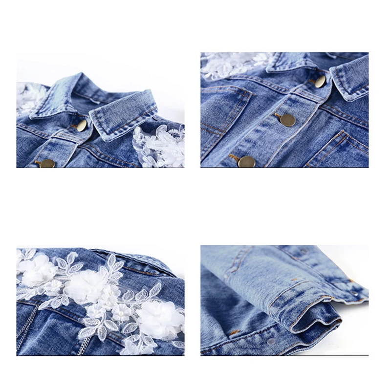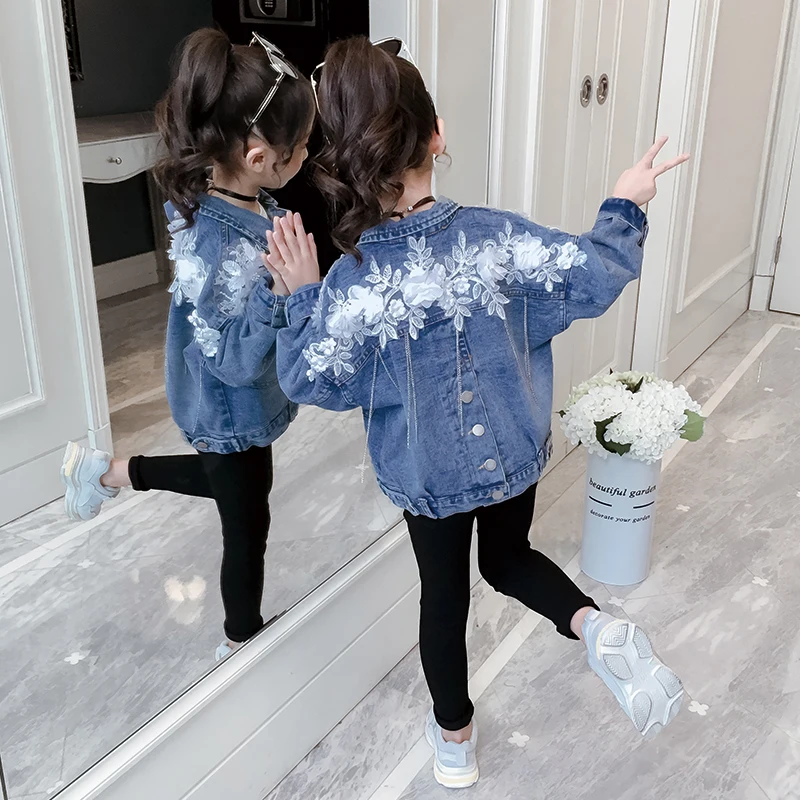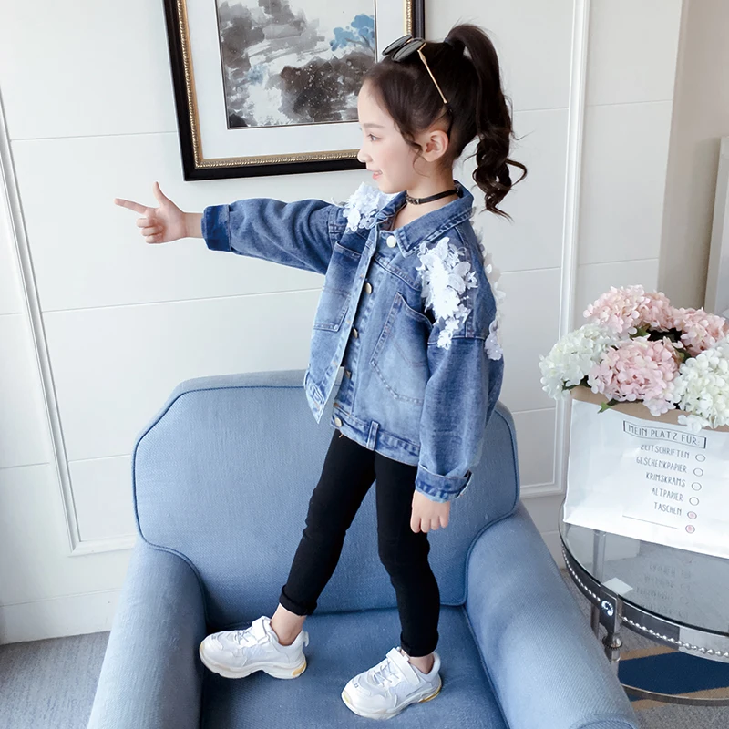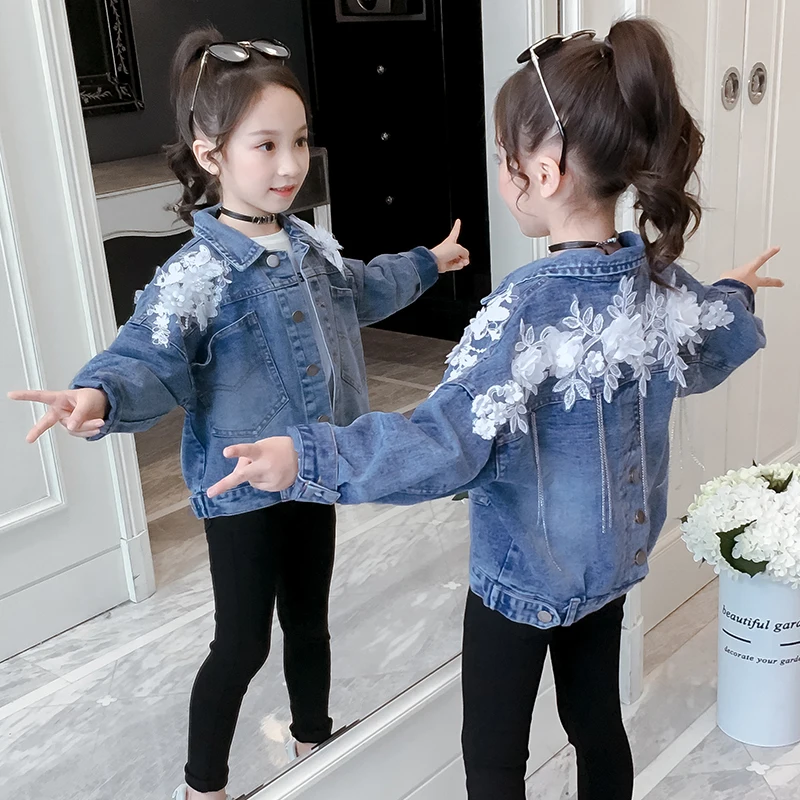 2020 модные весенние куртки для девочек, детские джинсовые пальто, кружевная одежда с белыми цветами, джинсовые топы с отложным воротником для подростков 6, 8, 12 лет