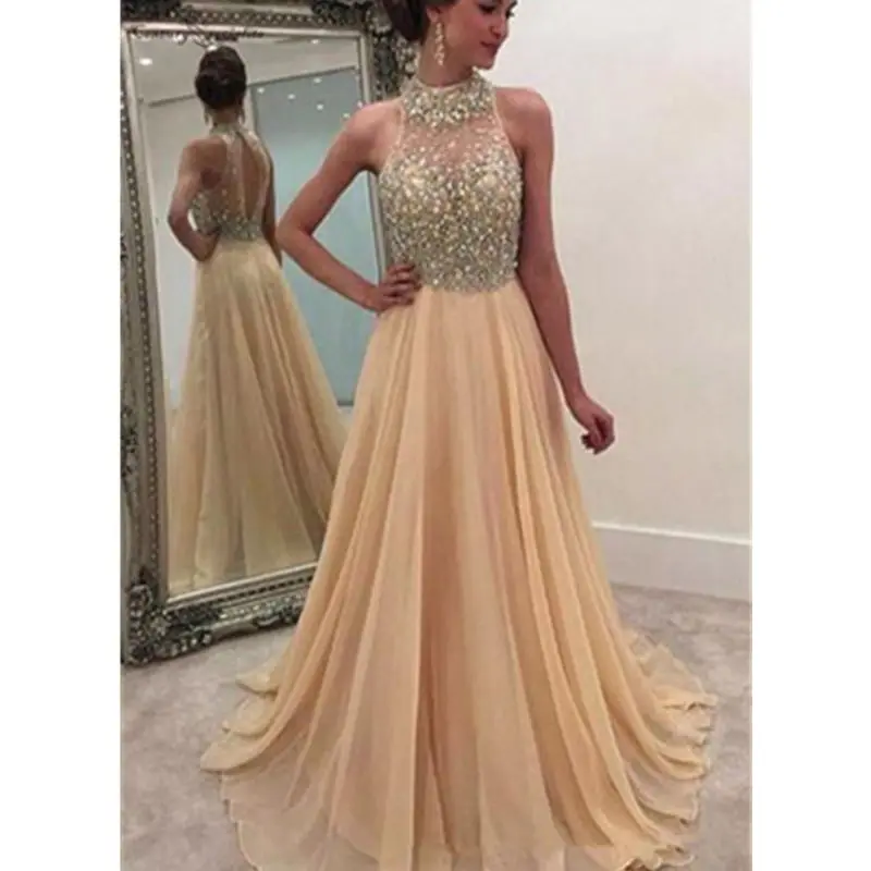 Элегантные бисером Холтер шифон Вечерние платья трапециевидной формы Выпускные Платья цвет шампанского без рукавов Формальное платье длиной до пола Вечерние платья