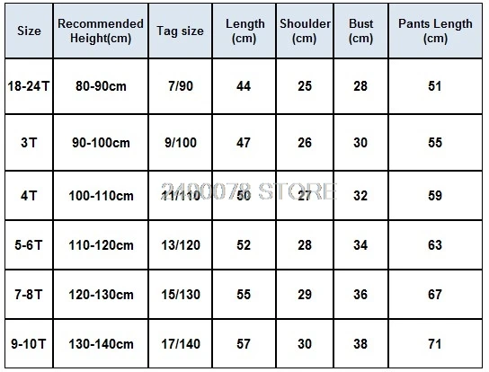 РазмерыРекомендуетсяВысота (см)ТегРазмерДлина(См)Плечо(См)Бюст(См)БрюкиДлина(См)18-24T80-90 см7/90442528513T90-100 см9/100472630554Т100-110 см11/11050273259От 5 до 6 лет110-120 см13/12052283463От 7 до 8 лет120-130 см15/13055293667От 9 до 10 лет130-140 см17/14057303871